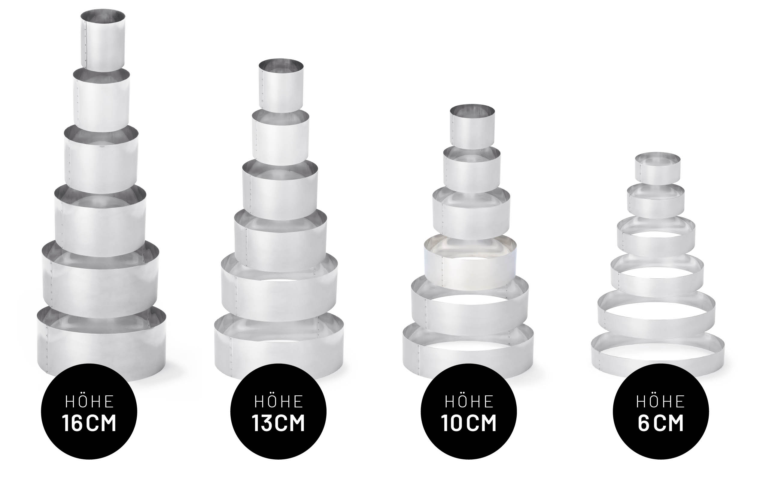 Die robusten Tortenringe aus 1 mm starkem Edelstahl sind je nach Ihrem Bedarf im passenden Durchmesser und in Höhen bis zu 20 cm lieferbar. So können Sie Ihren Backofen in Breite und Höhe optimal ausnutzen.