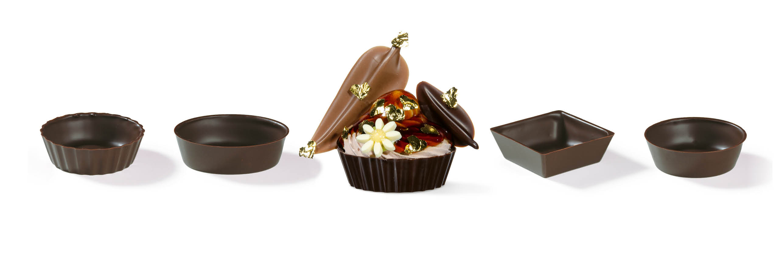 Hier sehen Sie gruselig süße Dekore aus Schokolade für Ihre schaurig leckeren Produkte zu Halloween. Gebrauchsfertig und praktisch sind unsere gebackenen Tartlets und die klassischen Cups aus dunkler Schokolade.