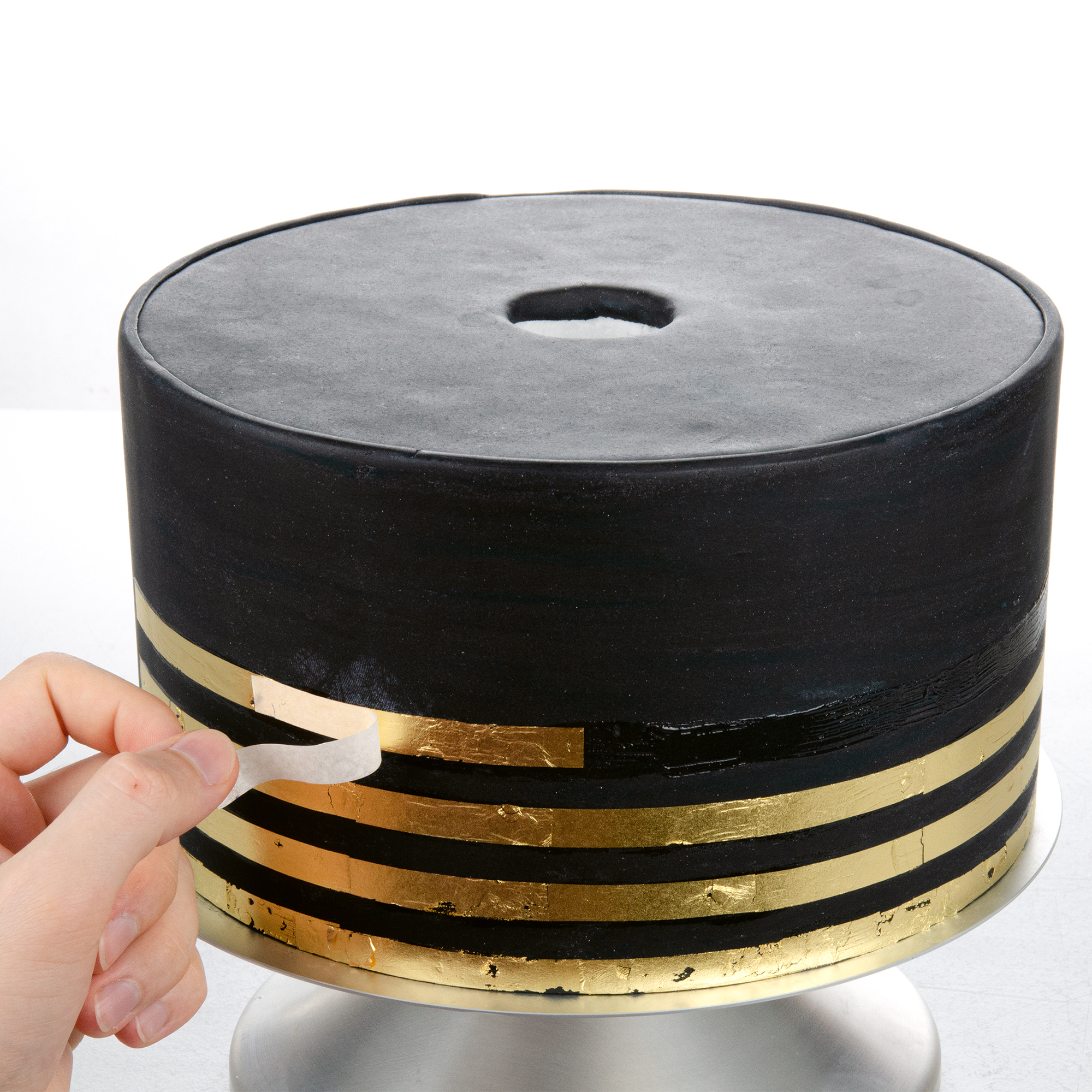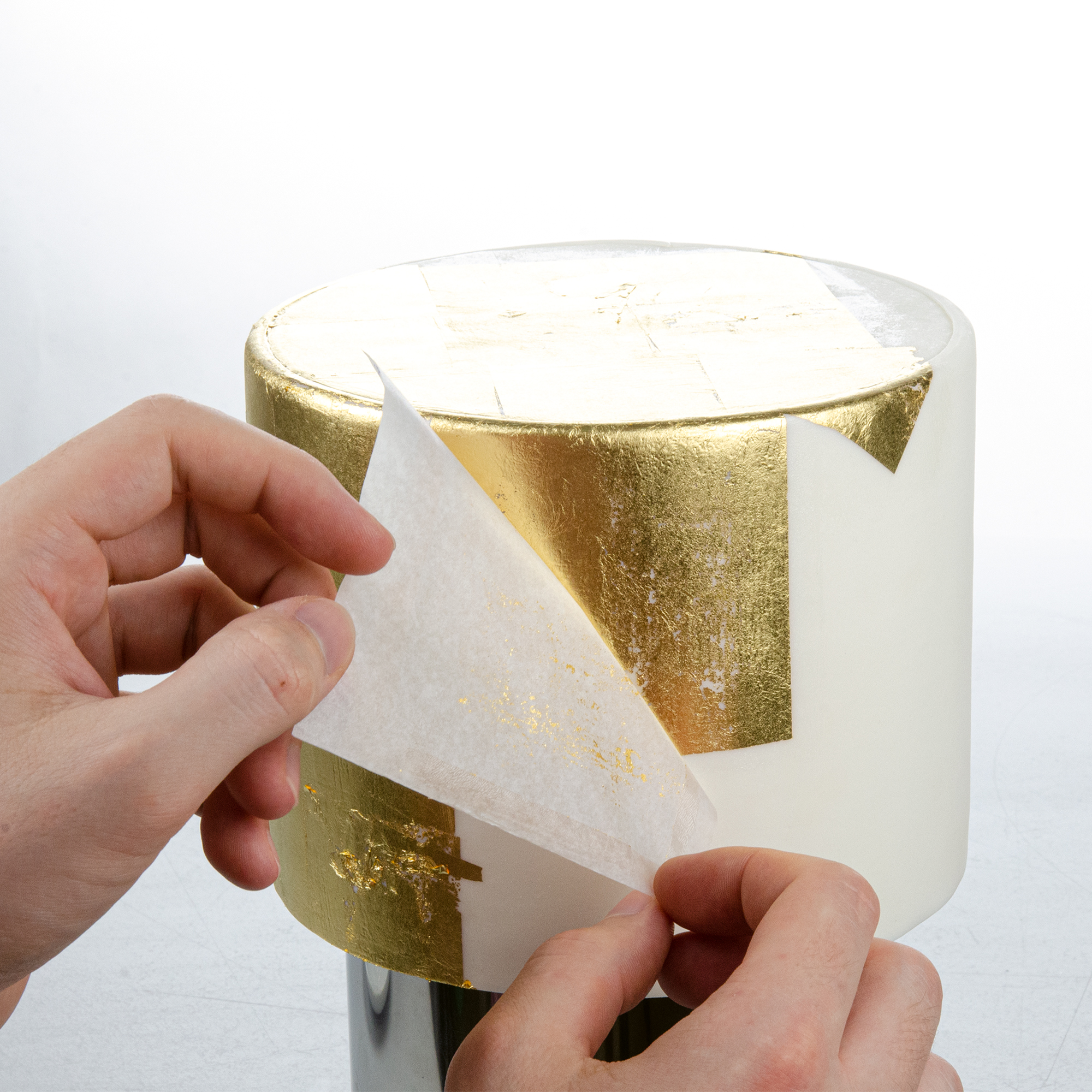 Dieses essbare Blattgold wird im Heftchen zu 25 Bögen geliefert. Der einzelne Blattgoldbogen ist jeweils auf ein spezielles Transferpapier gepresst und durch ein feines Seidenpapier voneinander getrennt. Obwohl das Blattgold hauchfein ist und kaum Gewicht hat, kann es auf dem Transferpapier leicht an die gewünschte Stelle der Torte oder des Desserts transportiert werden. Damit sich das Blattgold vom Transferpapier löst und an der Torte oder dem Dessert haften bleibt, ist eine leicht klebrige Oberfläche notwendig. Eventuell kann man mit etwas Kaltgel nachhelfen. Diese Transferform des Blattgoldes verlangt weniger Übung beim Verarbeiten. Die anspruchsvollere Variante wäre das lose Blattgold.Echt Gold