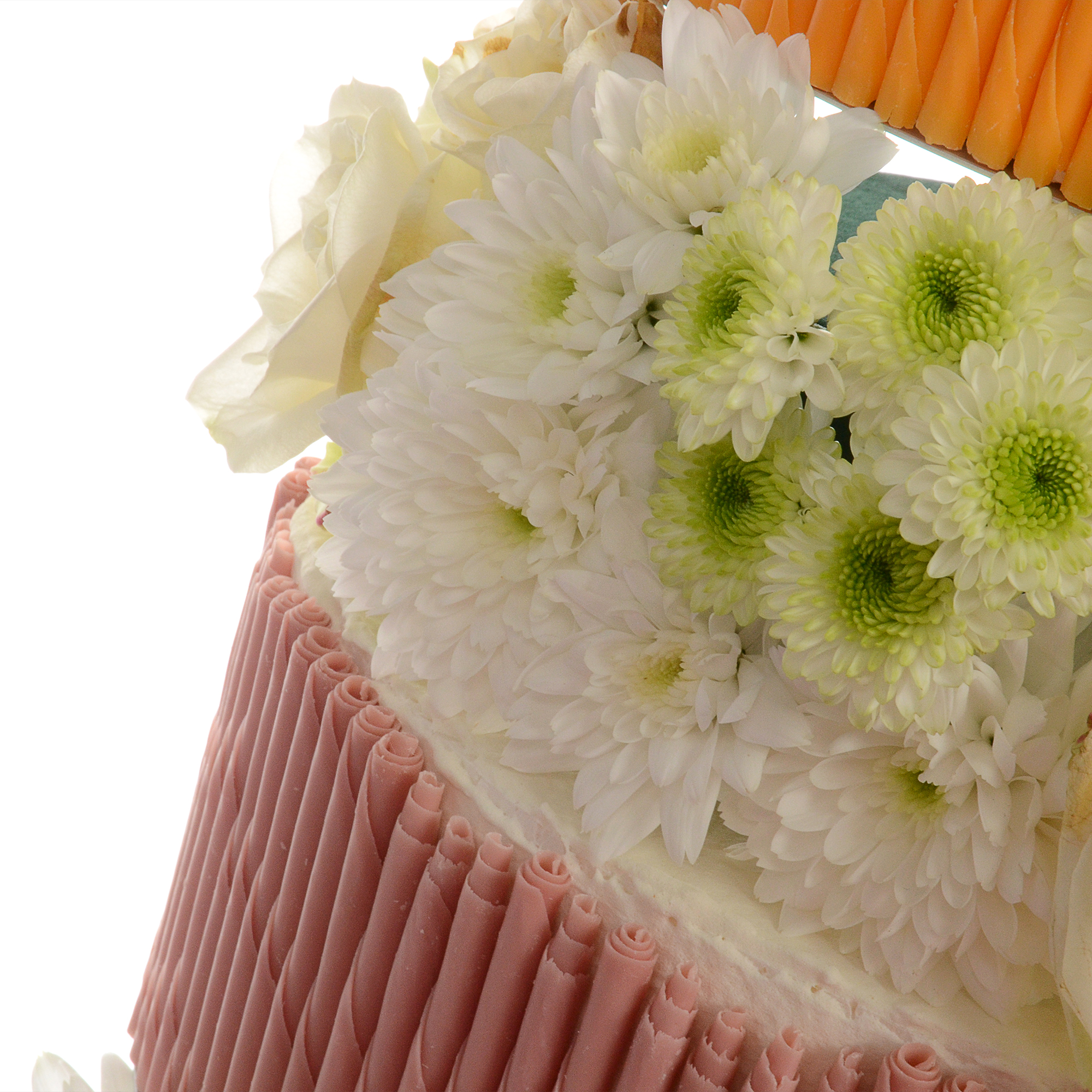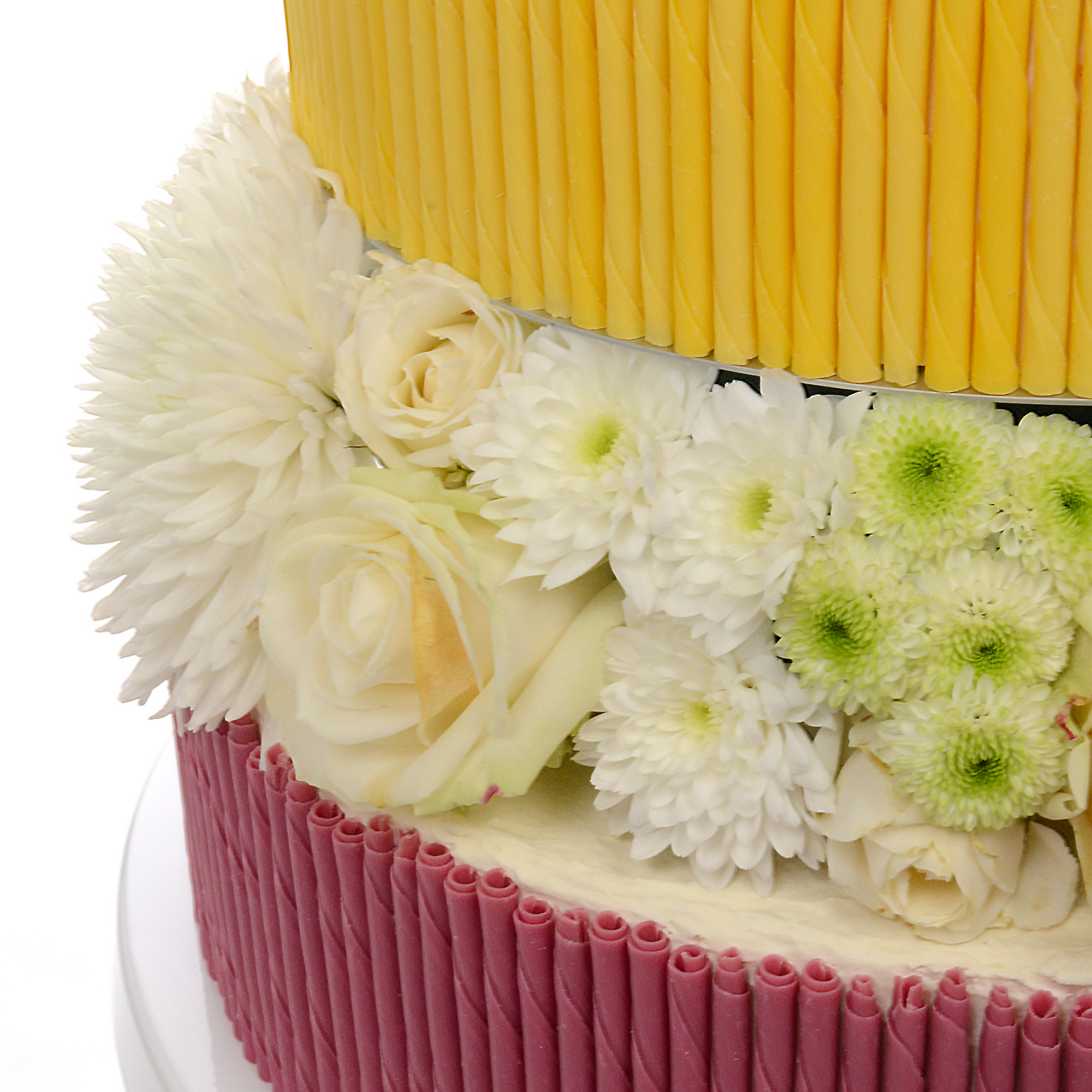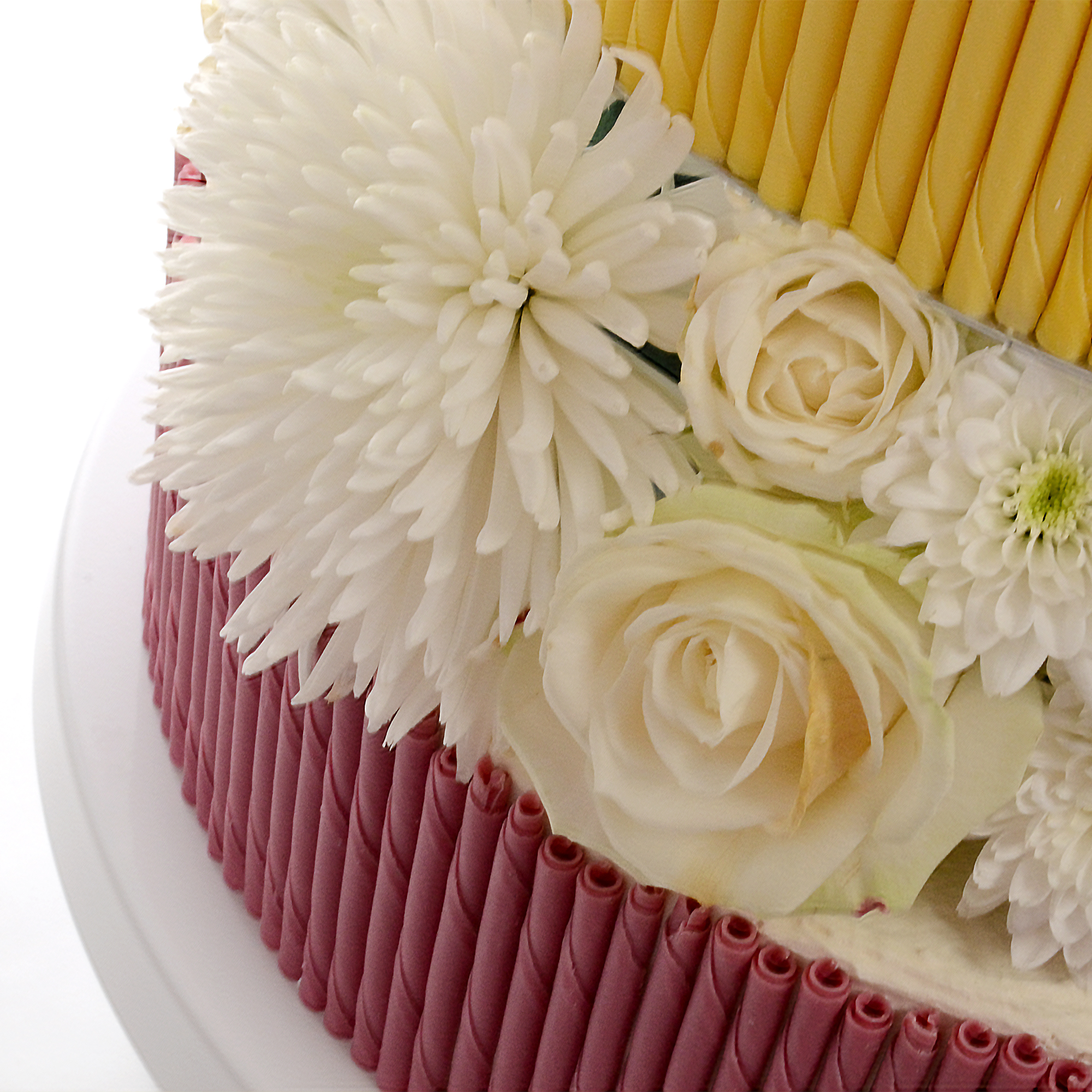 Die Ränder dieser 4-stöckigen Torte sind mit den Cigarillos Multicolor aus Schokolade in 4 verschiedenen Farben dekoriert.Zwischen den Torten sorgt ein üppiger Dekor mit frischen echten Rosen, Crysanthemen und Astern für eine freundlich blumige Wirkung.