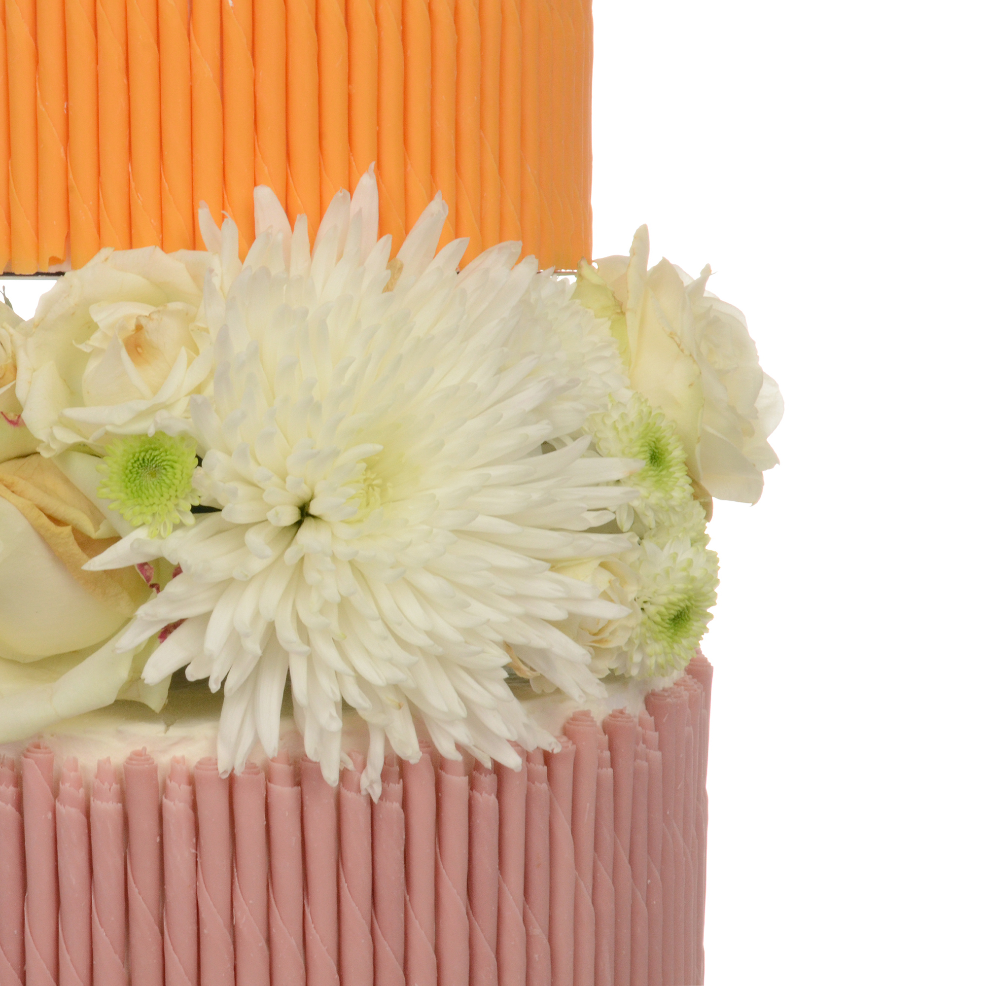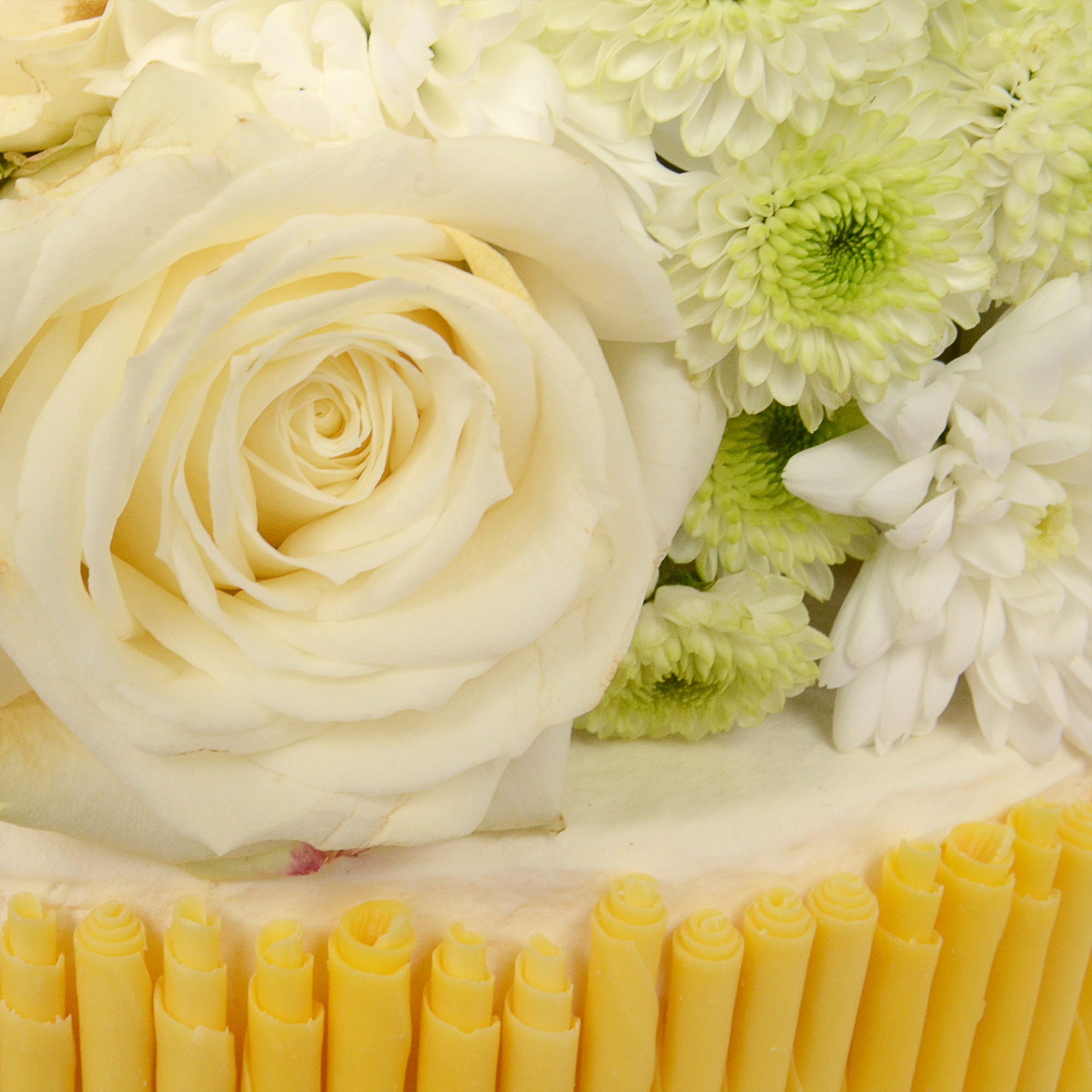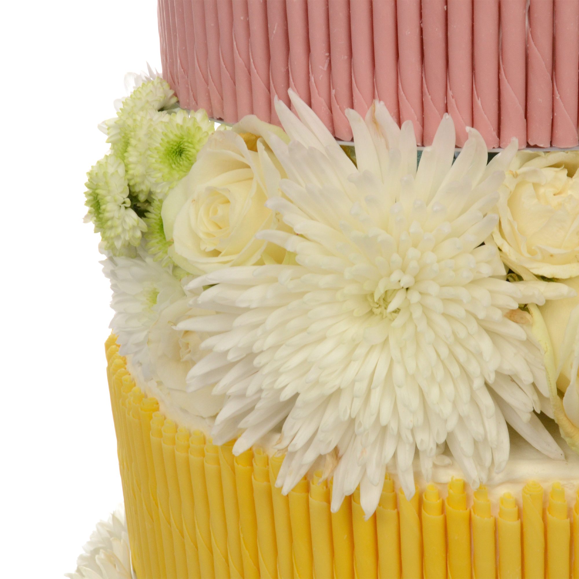 Die Ränder dieser 4-stöckigen Torte sind mit den Cigarillos Multicolor aus Schokolade in 4 verschiedenen Farben dekoriert.Zwischen den Torten sorgt ein üppiger Dekor mit frischen echten Rosen, Crysanthemen und Astern für eine freundlich blumige Wirkung.