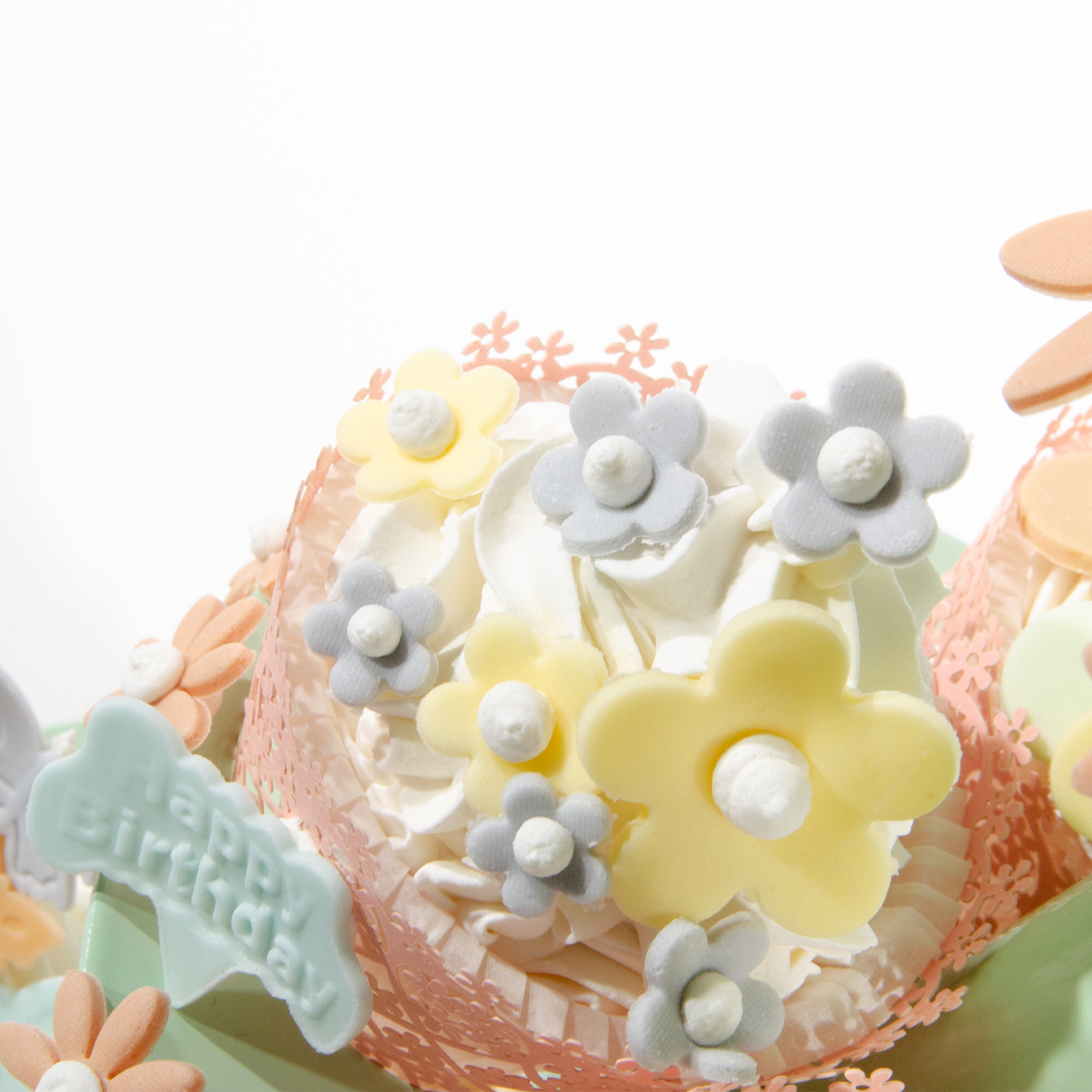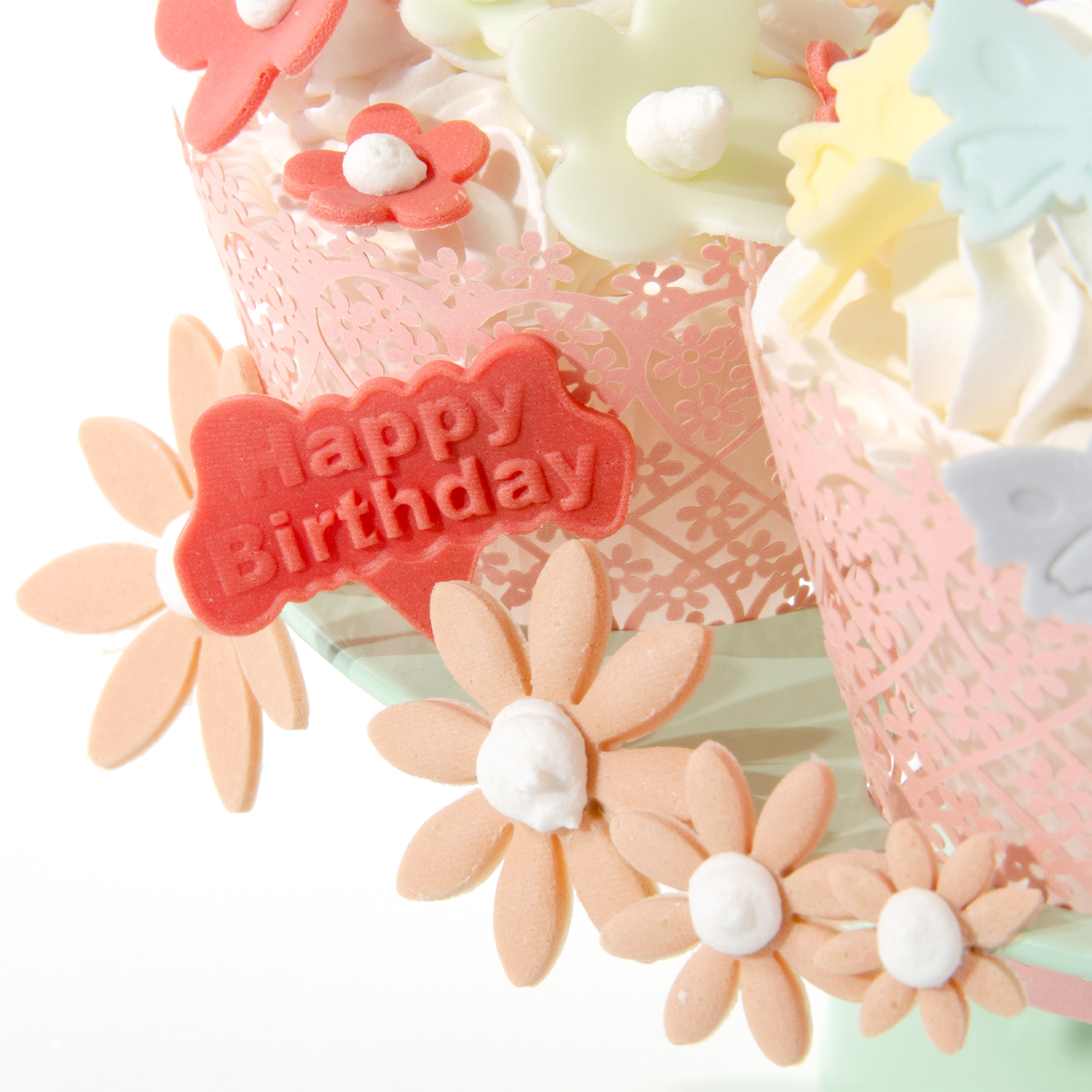 > Das Törtchen mit Schlaufentuff, "Happy Birthday" und ausgestochenen Blumen dekorieren