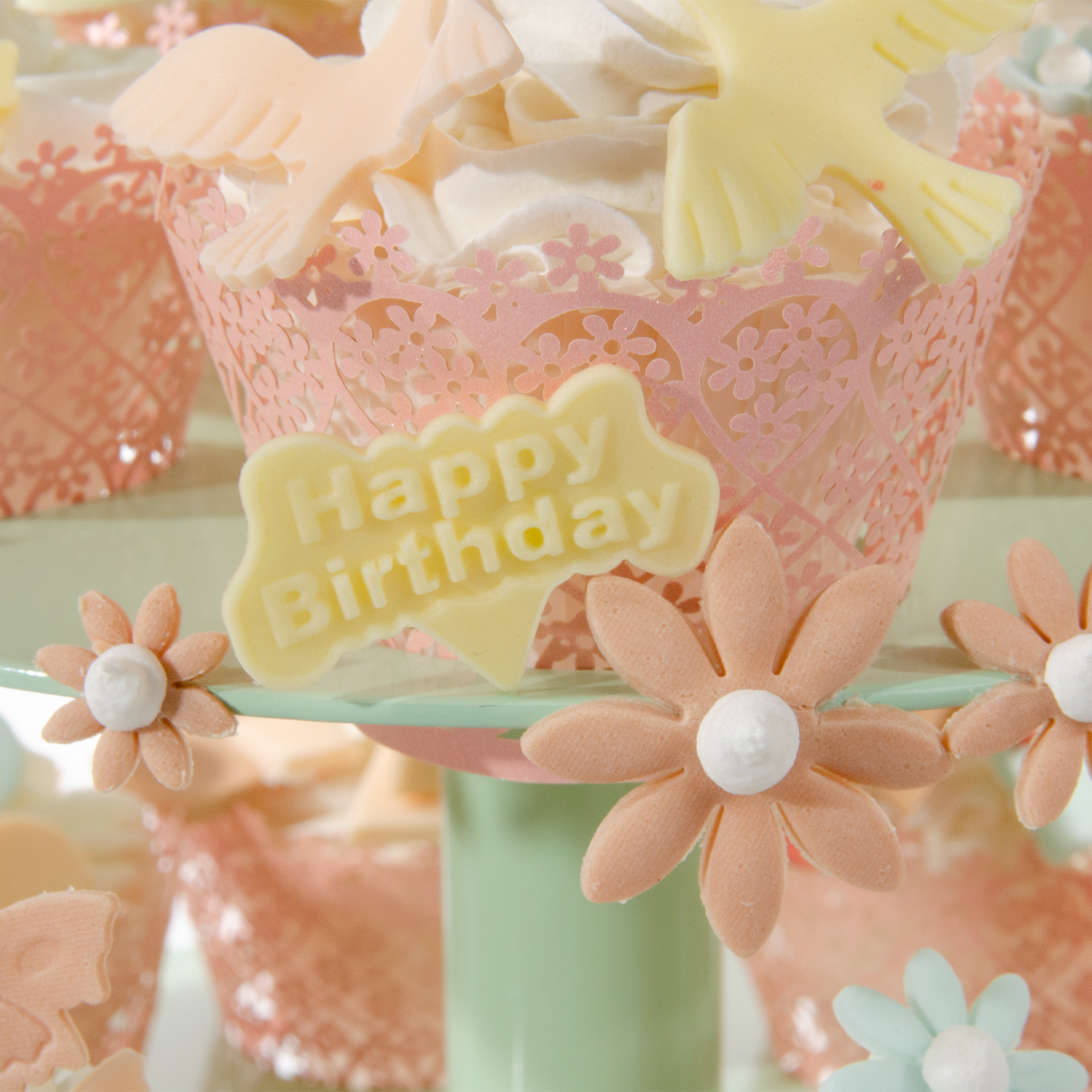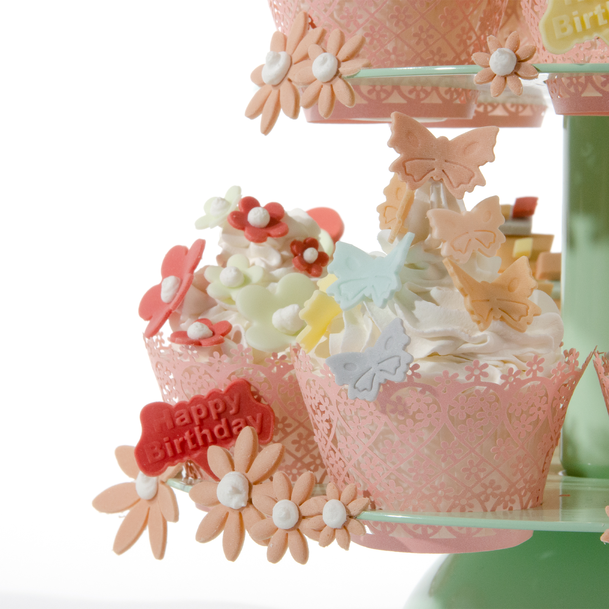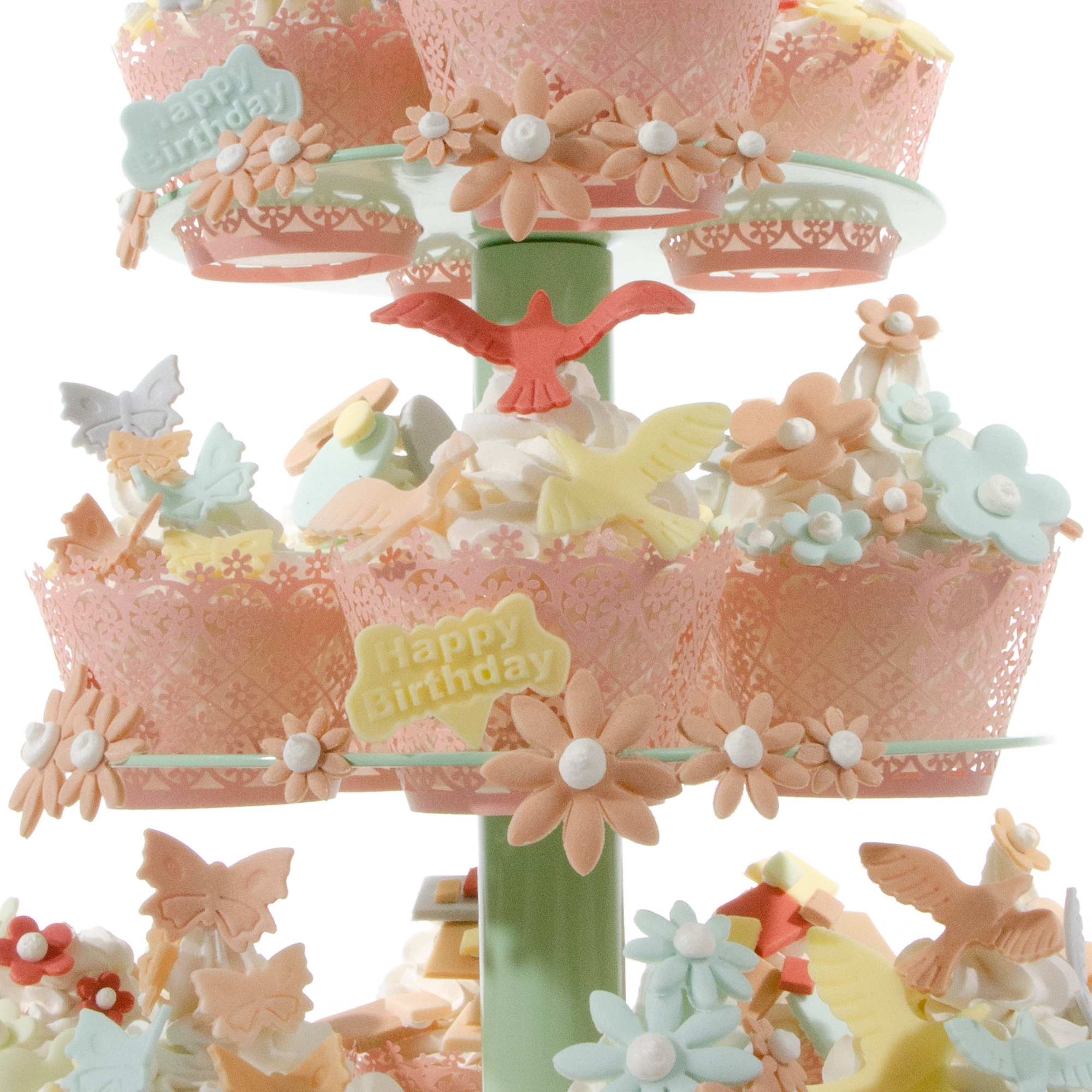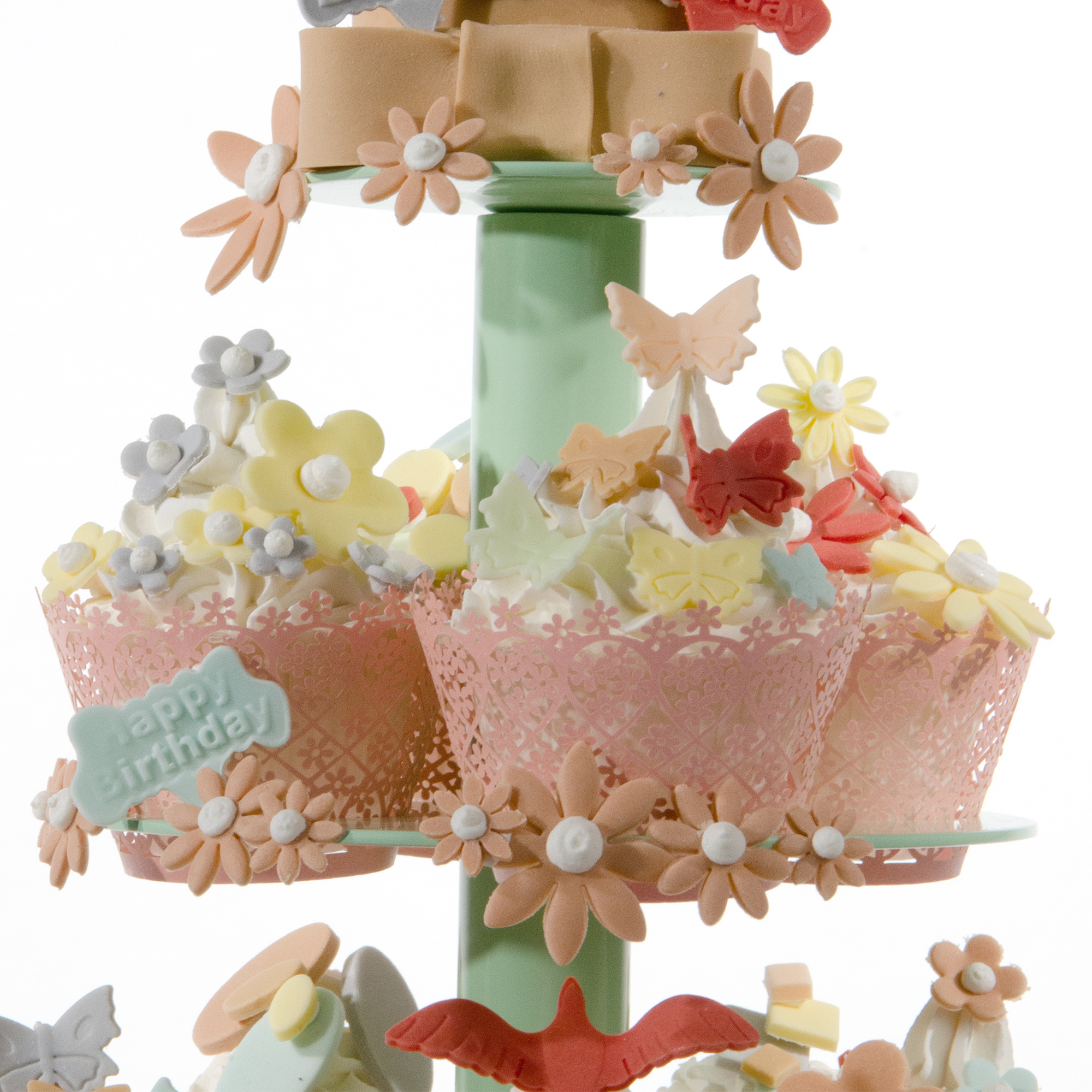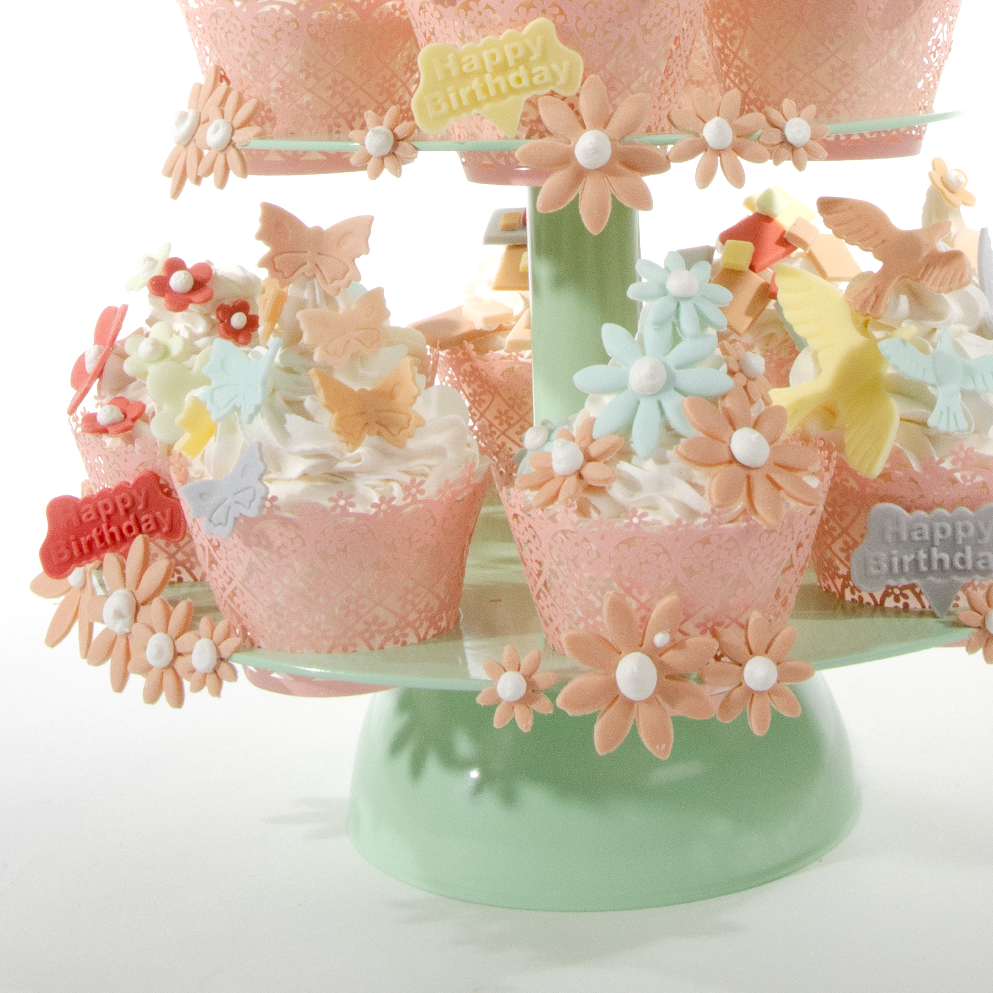 Diese kleine Mini Cupcake Geburtstagstorte hat zusätzlich ein kleines Mini Törtchen mit Schleifentuff und Geburtstag Einsteckern ganz oben. Sie ist komplett in modischen „VINTAGE“ Farben gehalten.Das oberste kleine Mini Törtchen ist mit Fondant überzogen. Dekoriert ist es mit ausgestochenen Blüten, ausgestochenen "Happy Birthday" Einsteckern sowie einem hübschen Schleifentuff aus Fondant. Die Mini Cupcakes der unteren 3 Stockwerke haben hübsche Manschetten mit rosa Blümchendekor. Zur Dekoration wurde die ganze Bandbreite der kleineren praktischen Ausstecher mit dem schnellen Federmechanismus genutzt.