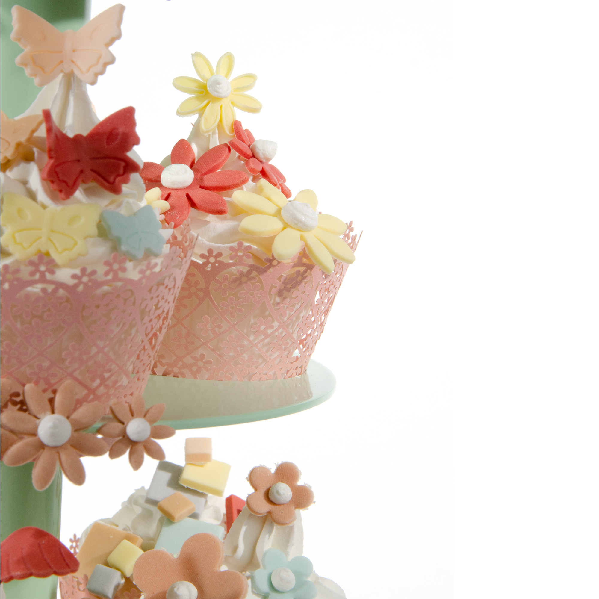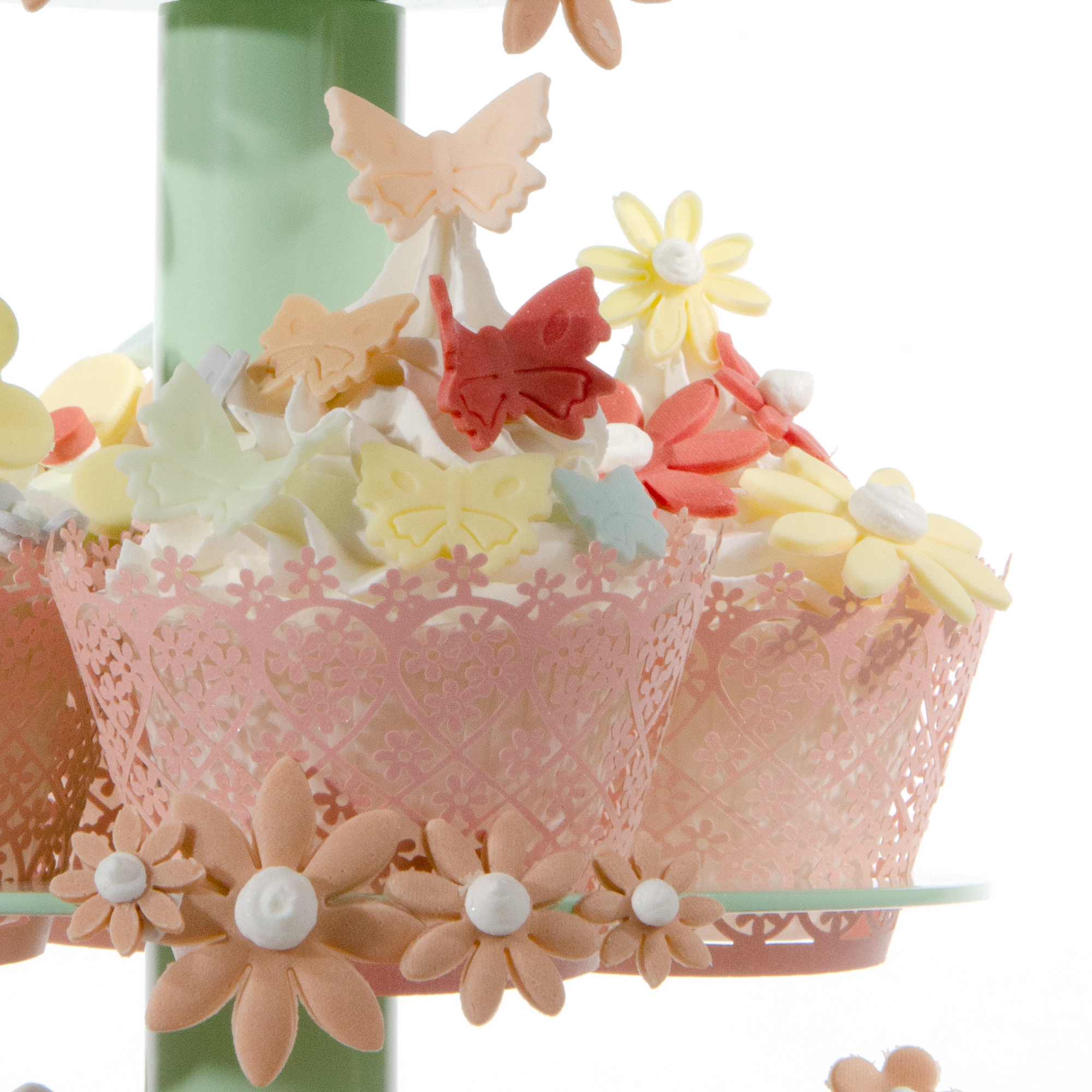 Die hier verwendete MINI CUPCAKE SPECIAL 4 ETAGERE in Hellgrün gehört zur XS Sertie und hat eine zierliche Größe. Sie bietet insgesamt 17 Aussparungen genau passend für Mini Cupcakes. Die oberste kleine Platte ist mit 7,5 cm Durchmesser gut für ein Mini Törtchen geeignet. Die Ränder der Platten sind ebenfalls mit ausgestochenen Blüten dekoriert.