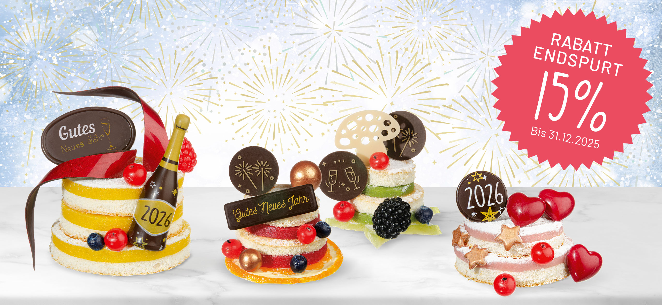 Lassen Sie sich inspirieren von unseren Dekoren für Ihre Glücksbringer, Torten, Törtchen und Desserts zum Jahreswechsel.