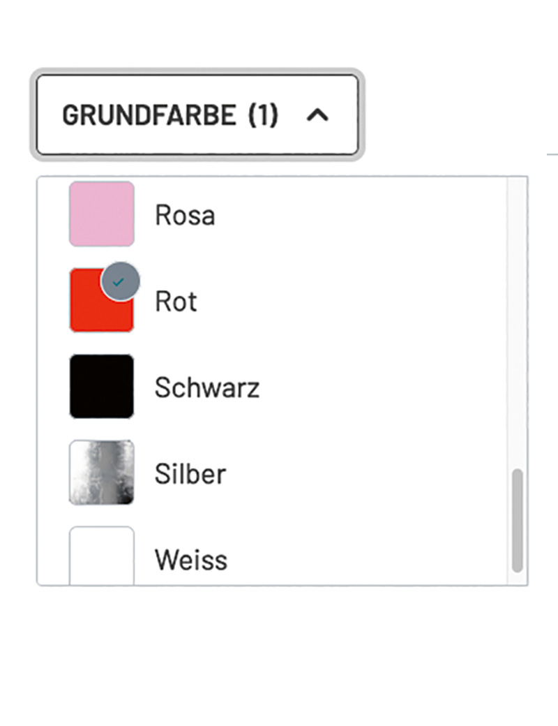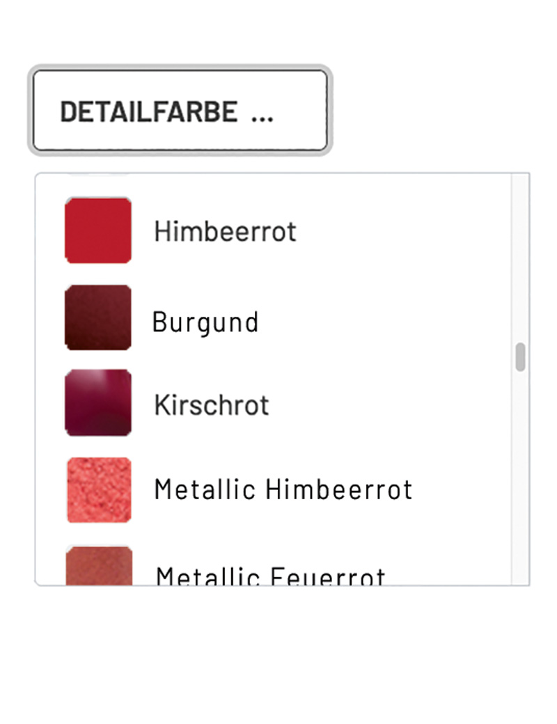Wählen Sie aus wenigen Grundfarben, wie zum Beispiel die Farbe Rot. Aus den zur Grundfarbe Rot gehörenden Detailfarben können Sie alle Rottöne wählen, die für Sie interessant sind, wie zum Beispiel Himbeerrot, Kirschrot, Burgund..