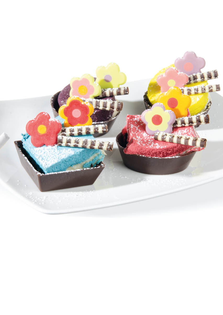 Viele kleine Desserts sind machbar in unseren Cups und Ringen aus Schokolade. Mit den bunten Auflegern, Spiralen und Stäbchen können Sie alles mit viel Spaß dekorieren.