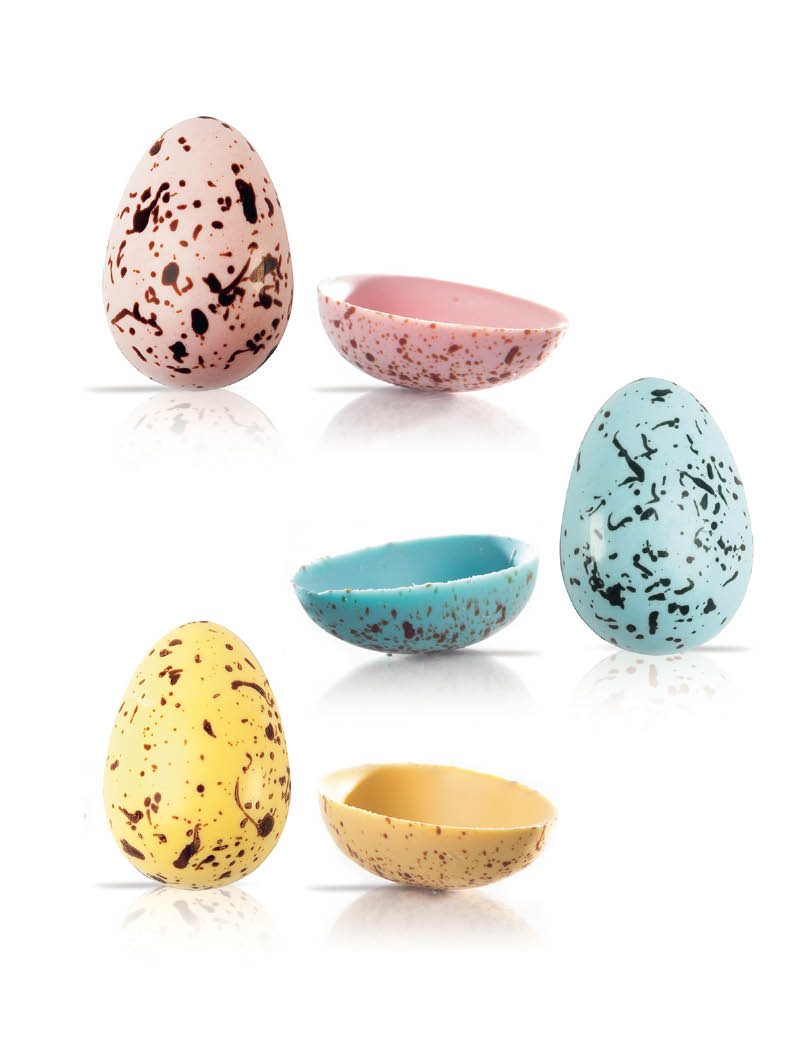Diese halben Eier aus Schokolade sind in verschiedenen Farben sortiert. Ein halbes Ei kann als kleines Füllschälchen oder auch einfach als Dekor verwendet werden. Mit 2 halben Eiern zusammen erhalten Sie einen Hohlkörper zum Füllen.