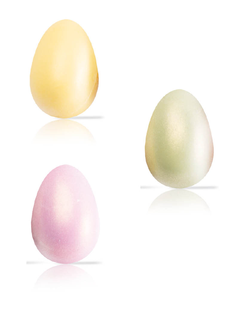 Diese Eier aus weißer Schokolade sind als Hohlkörper hergestellt. Sie sind in 3 Pastellfarben sortiert und sind sowohl für den Einzelverkauf als auch für hübsche Osterdekors auf Torten und Törtchen geeignet.