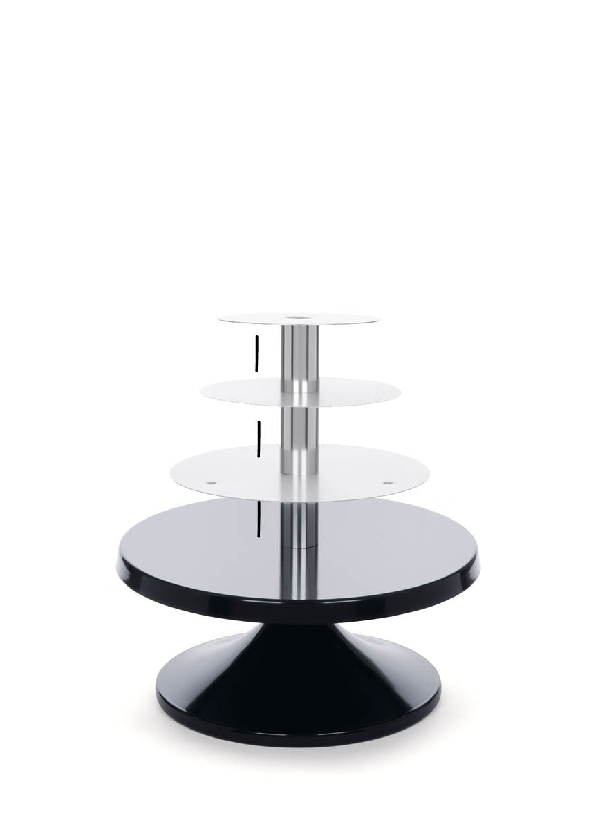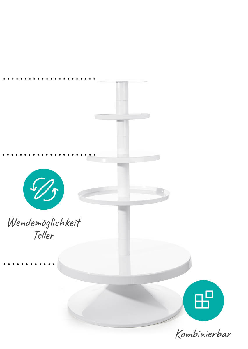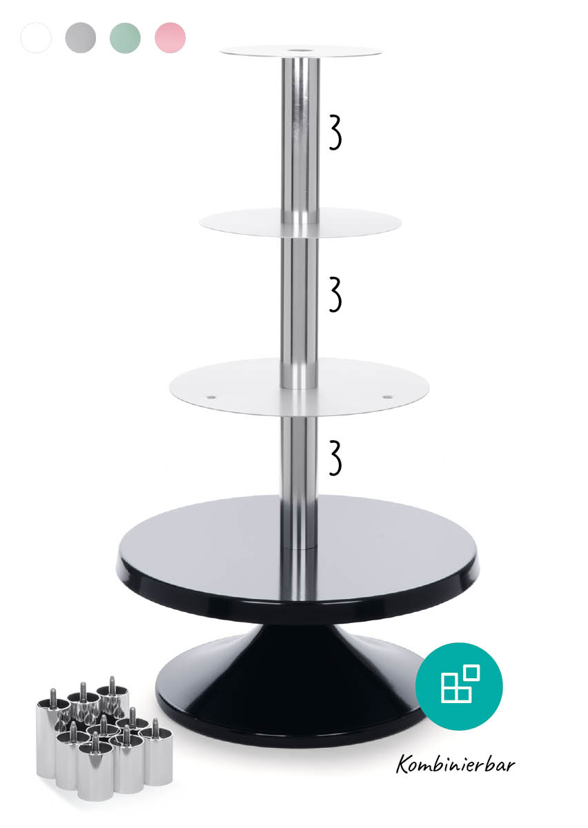 Der Schlüssel zur Etagere in verschiedenen Höhen sind die Mittelsäulen in KURZ, MEDIUM und LANG. Damit haben Sie immer den passenden Tortenständer für besonders niedrige oder für modisch hohe und schlanke Torten.