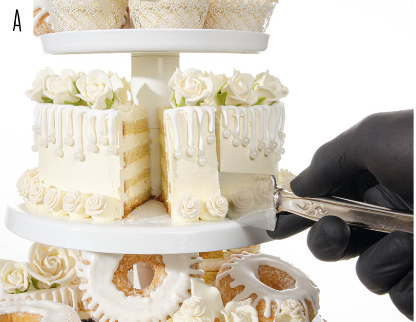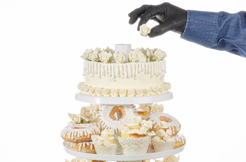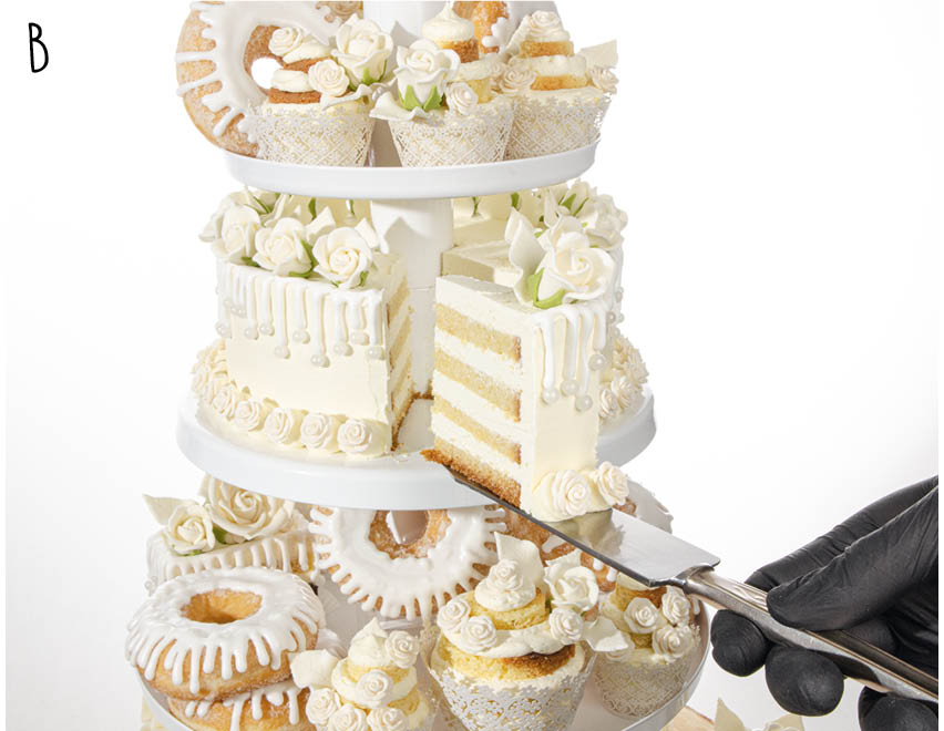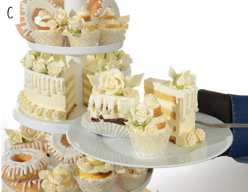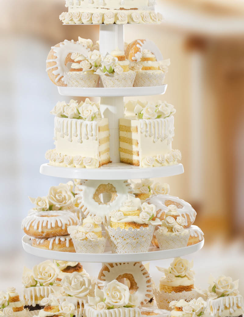 Mit dieser Festlichen Torte auf unserer großen CLASSIC TELLER 5 ETAGERE in weiß können Sie Ihren Kunden alles bieten: Traditionelle Torten zum Anschneiden, leckere Törtchen, Cupcakes, Mini Cupcakes und trendige Donuts. Sogar die Birkenrinden Basistorte können Sie essbar herstellen.