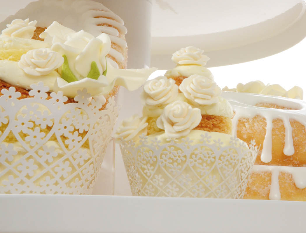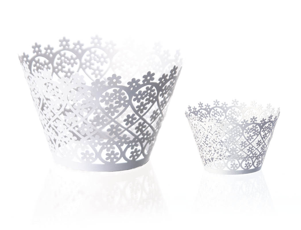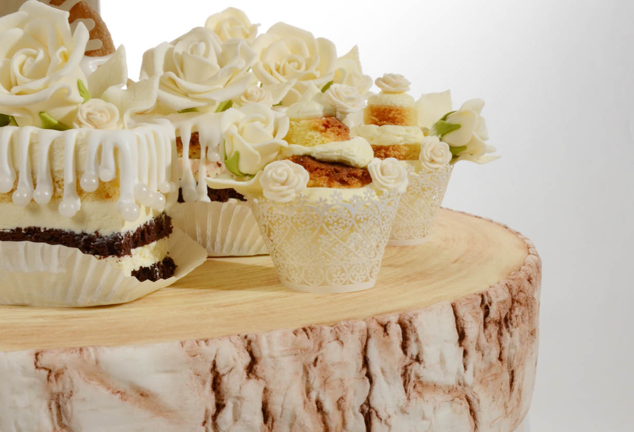 Für die Cupcakes und Mini Cupcakes auf dieser Festlichen Torte haben wir weiße Manschetten in groß und klein mit genau gleichem Dessin im Programm. Für eine elegante Hochzeitstorte die ideale Lösung.