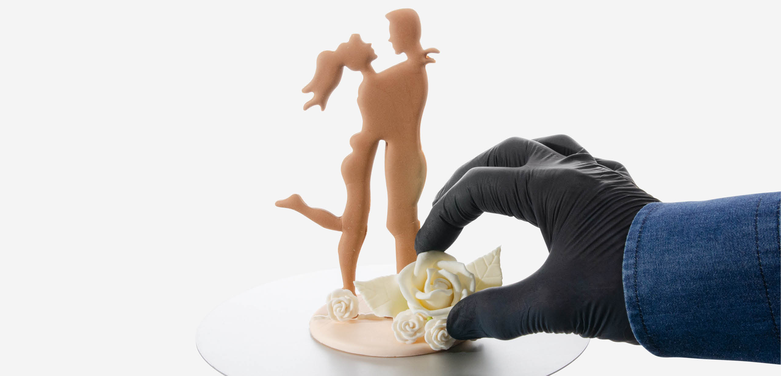 Nach der Trocknung etwas Zuckercreme in die Rille des Sockels geben und das Brautpaar befestigen. Die hübschen Rosen aus Tragant bringen auch zusätzliche Stabilität.