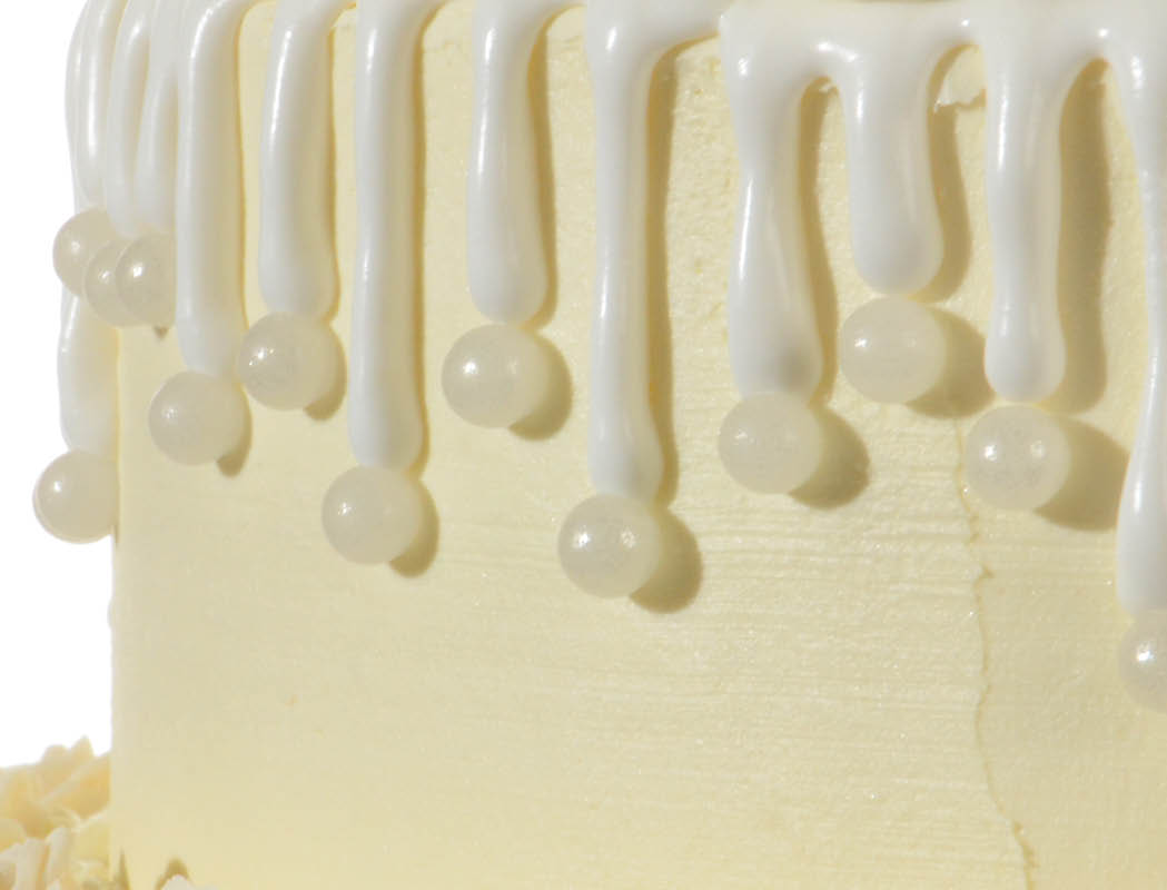 Unsere Dragee Perlen gibt es in vielen Pastell- und Metallicfarben. Für diese Torte sind die perlmuttfarbigen Perlen in groß und klein besonders gut geeignet.