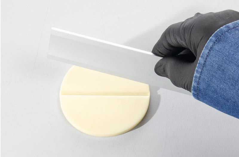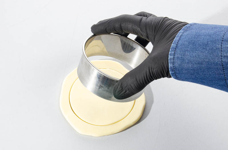 Ein Stück aufgelegte Frischhaltefolie erleichtert das saubere Ausstechen und das Abnehmen des Ausstechers.