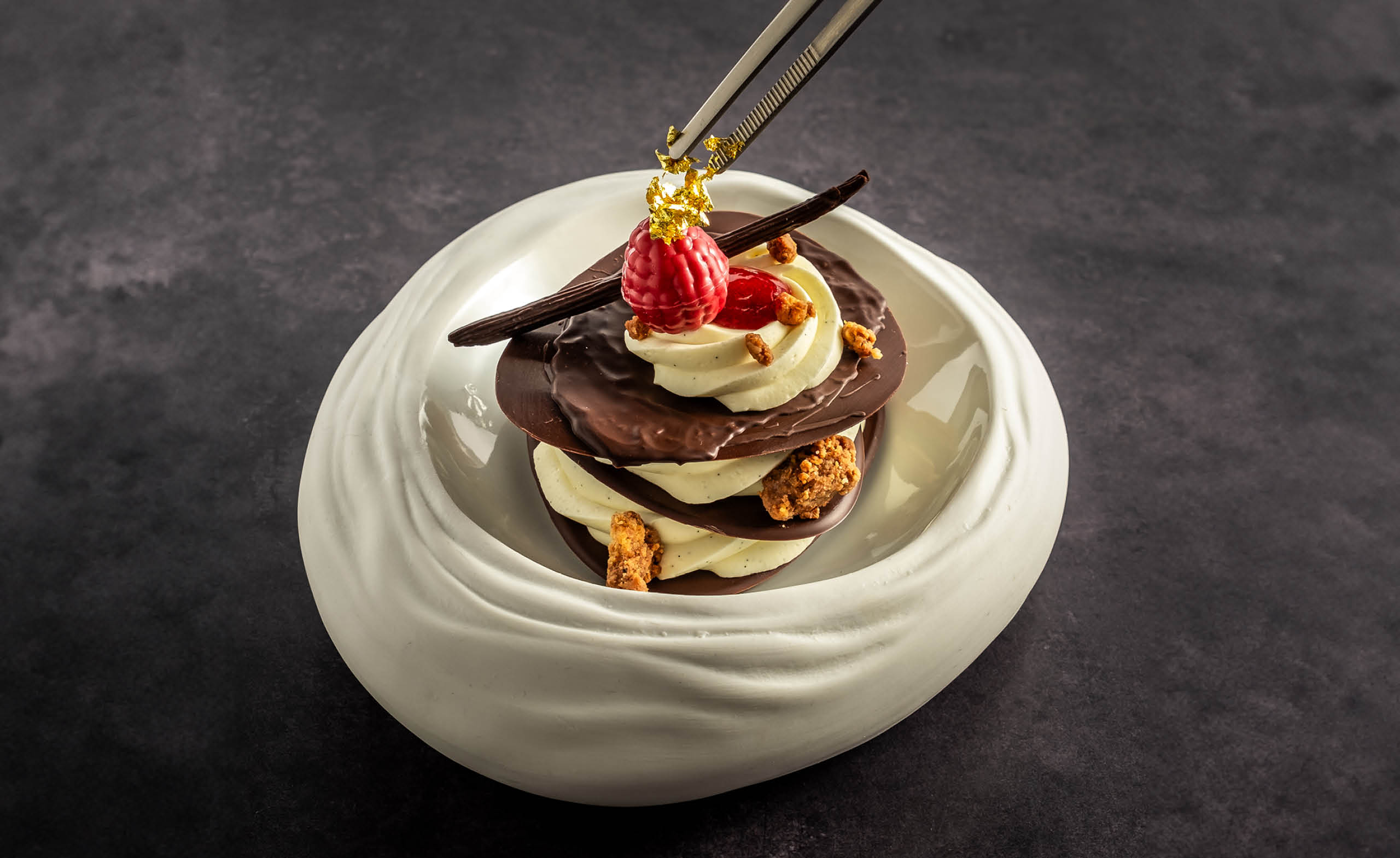 Dieser von Hand zusammengefügte Dekor ist aus dunkler Schokolade gefertigt. Als Aufleger für Herbst und Winter passt er für alle Törtchen, Desserts und Eisbecher.