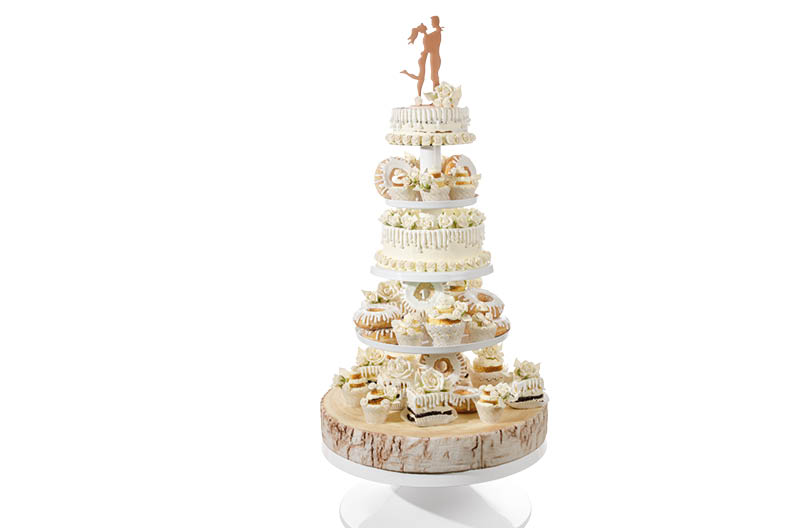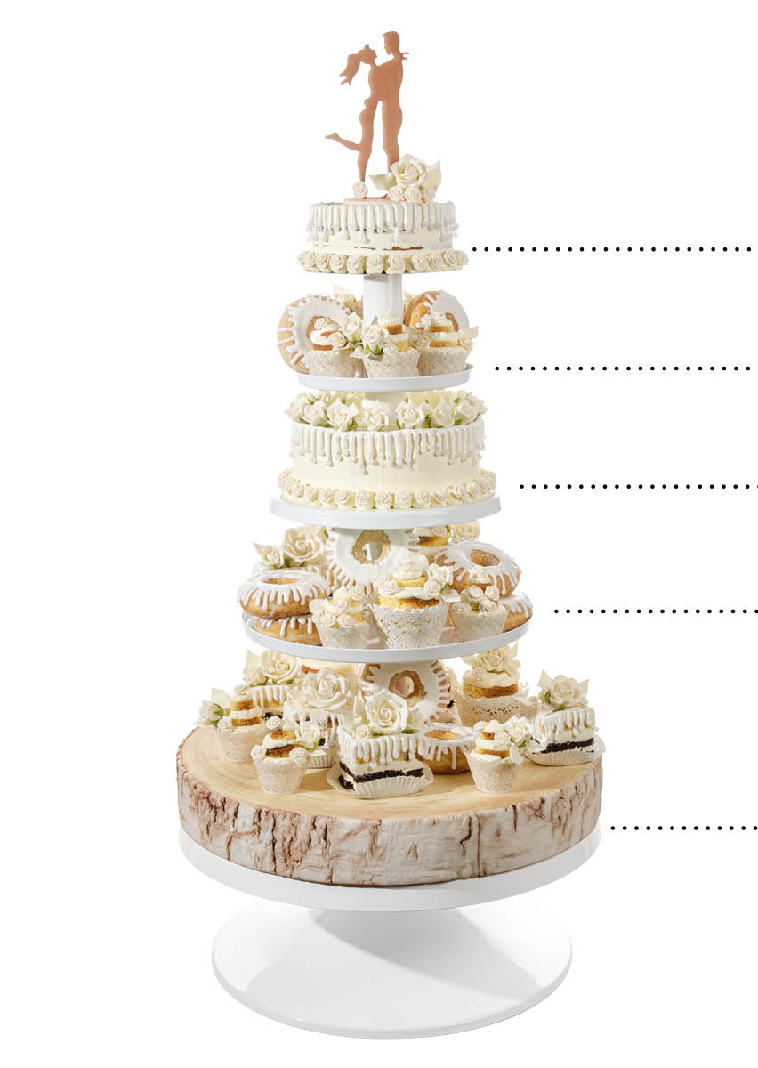 Für diese „DONUT HOCHZEITSTORTE“ haben wir die Etagere CLASSIC TELLER 5 verwendet und mit 7 kurzen, 2 medium Mittelsäulen und einer kleinen weißen Platte erweitert.