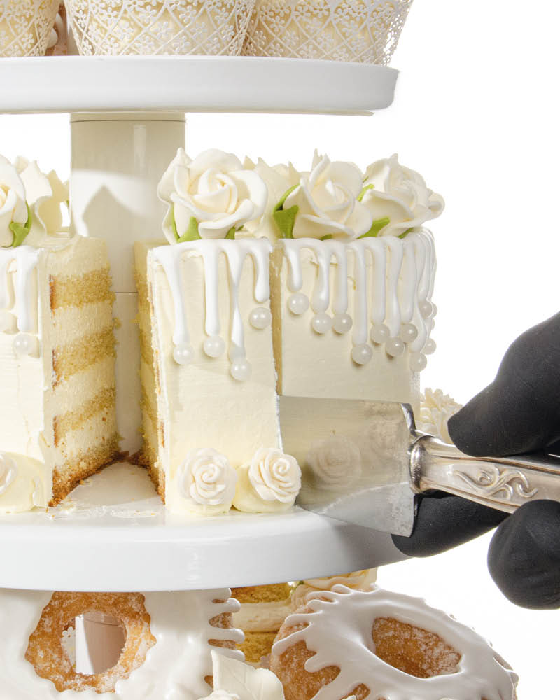 „Der Teller mit dem Rand nach unten montiert bietet eine ebene Schnittfläche für die Torte. Drehen Sie ihn mit dem Rand nach oben bietet er Schutz vor Herabfallen für Törtchen, Cupcakes, Mini Cupcakes und Donuts.“