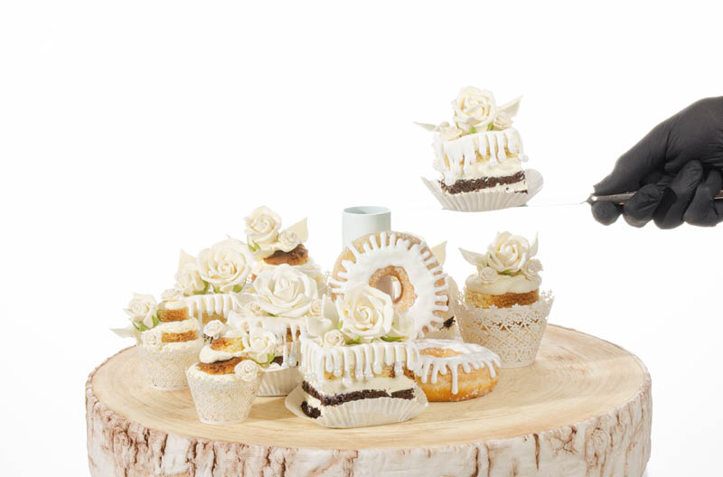 Direkt auf dieser Torte ist noch Platz für einige Törtchen, Cupcakes, Mini Cupcakes und Donuts.