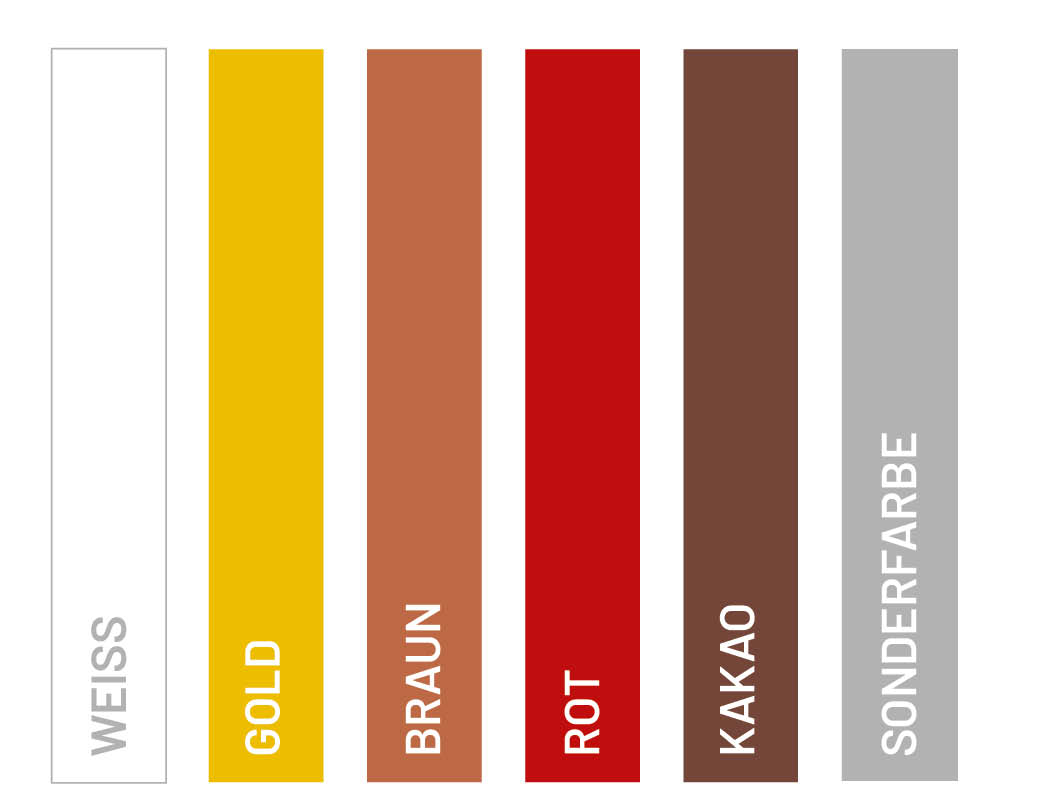 Wählen Sie aus 5 appetitlichen Standardfarben. Auch Sonderfarben sind möglich. Pro Farbe fallen einmalig 80,00 € Klischeekosten an.