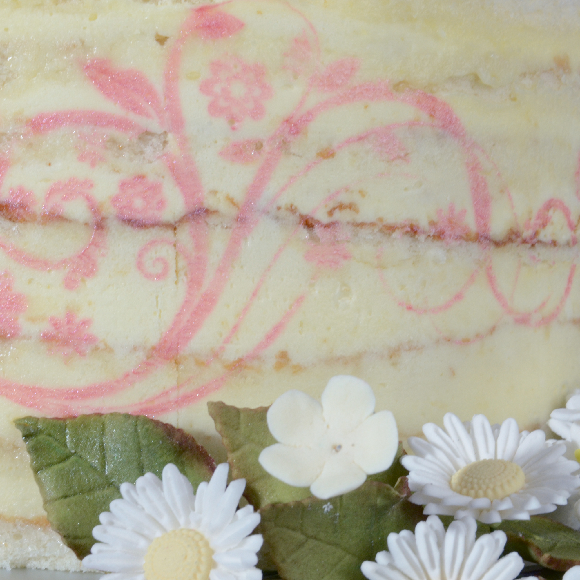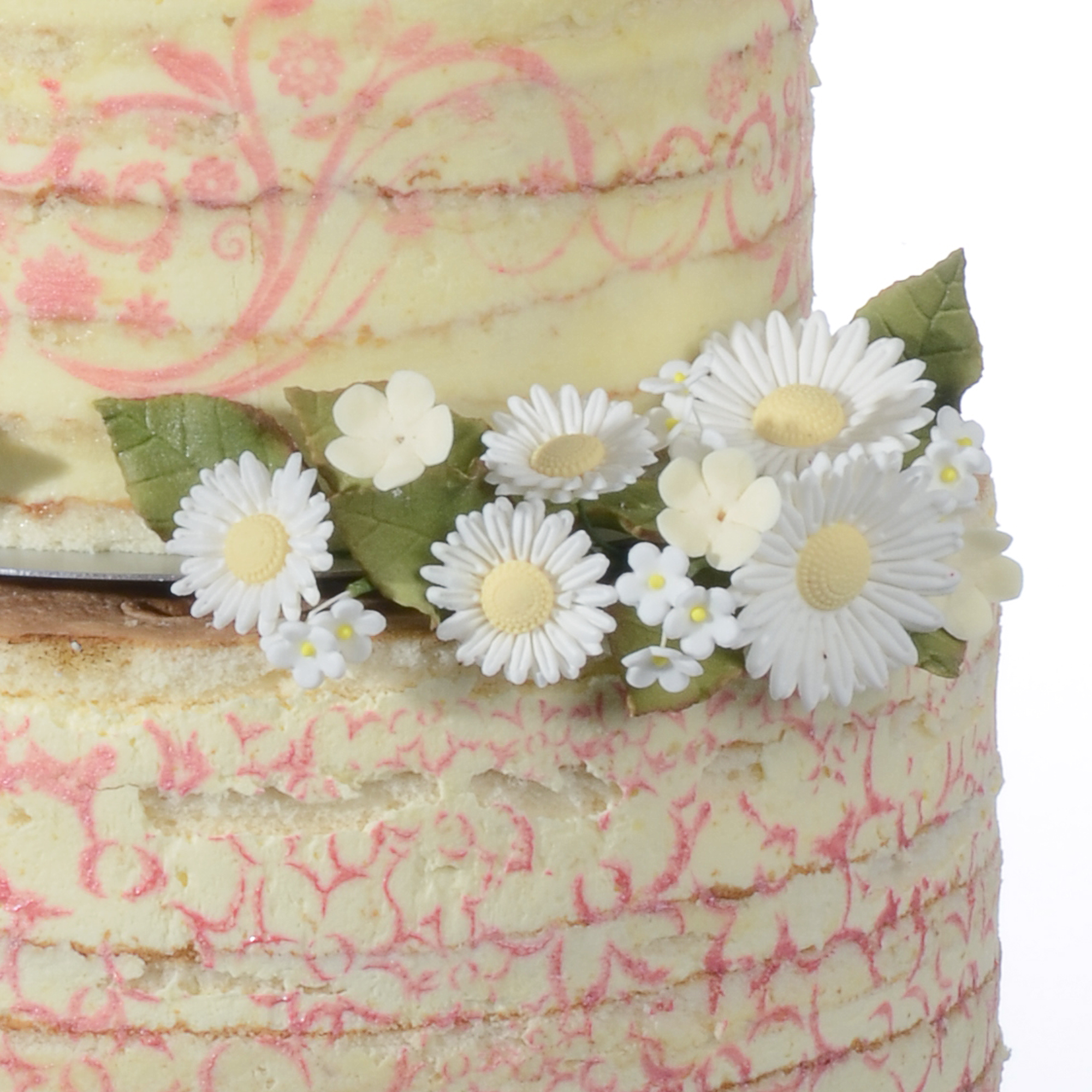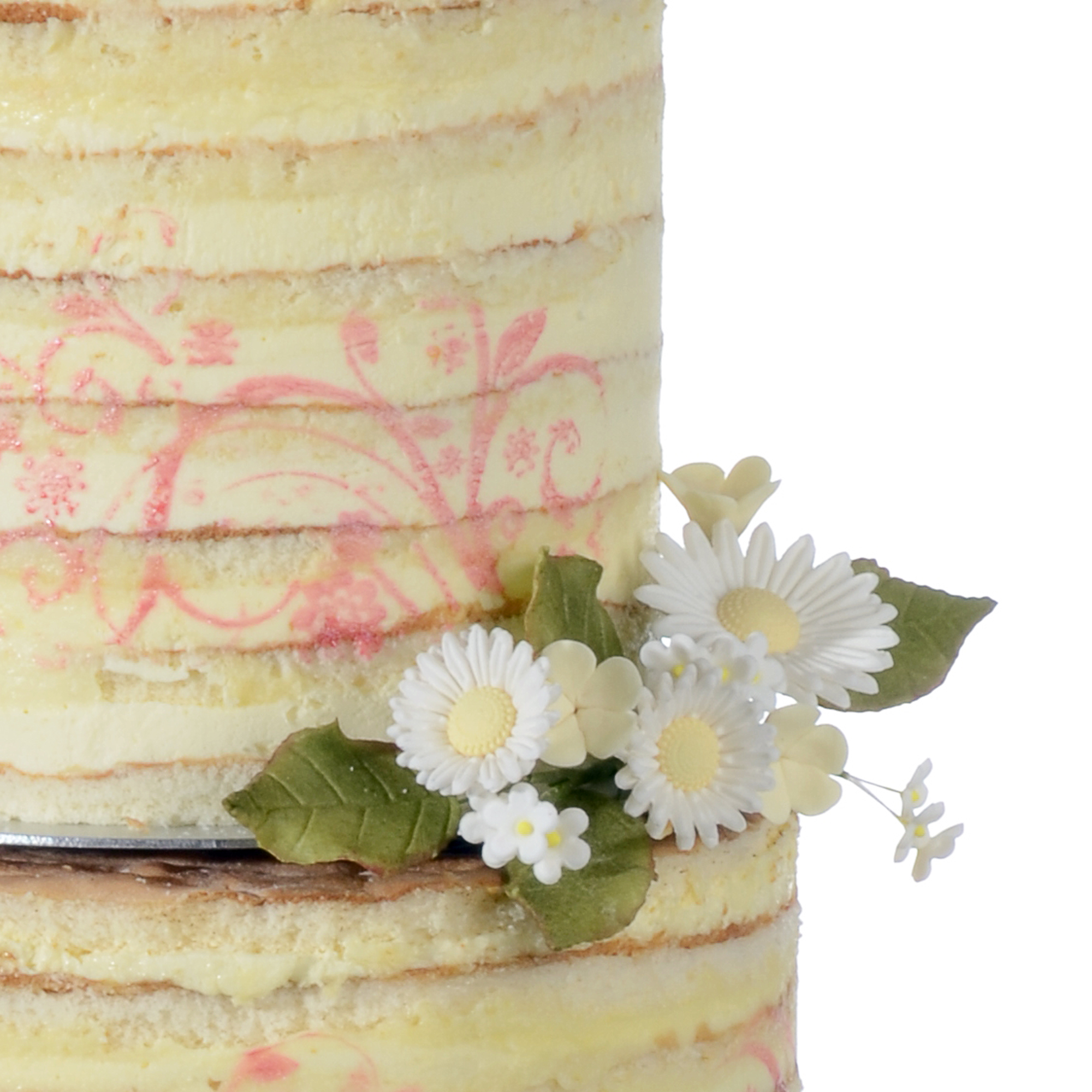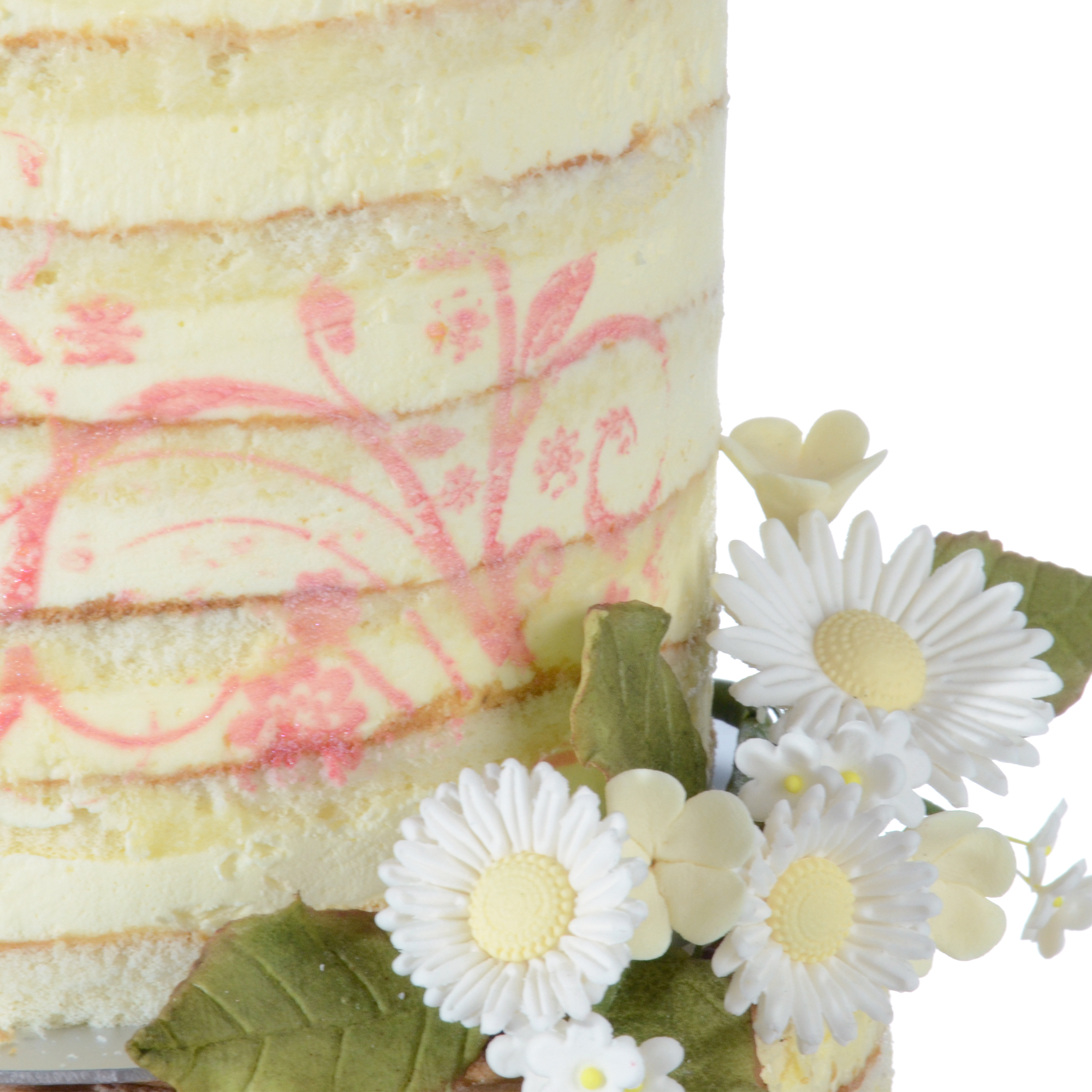 Für die einzelnen Etagen dieser 3-stöckigen Torte wurde abwechselnd Bisquit und Buttercreme in die zum Tortenständer passenden Ringe eingesetzt. Das ergibt eine "Festliche Torte" im "Naked Cake" Stil.Mit zwei verschiedenen Textil Schablonen und himbeer metallic gefärbtem Kaltgel zeigen wir hier, dass auch auf der Oberfläche einer "Naked Cake" der filigran feine Dekor dieser Schablonen sehr gut aussehen kann. Das lustige Brautpaar "BETTY" und Tragant Bouquets mit Margeriten und Gänseblümchen passen optimal zum Stil dieser Torte.