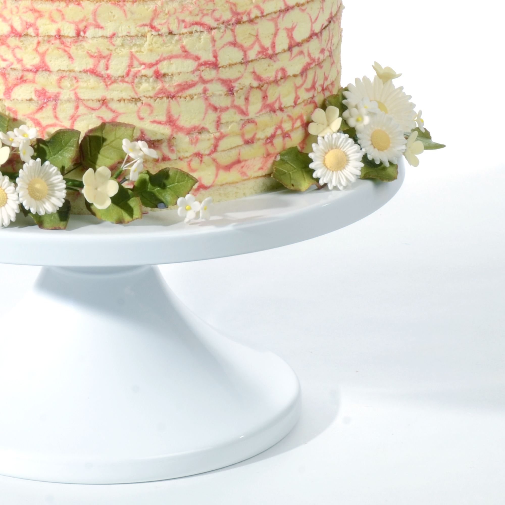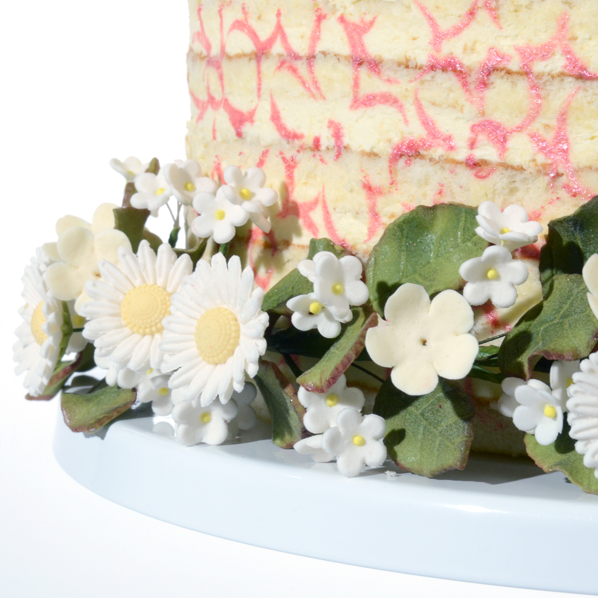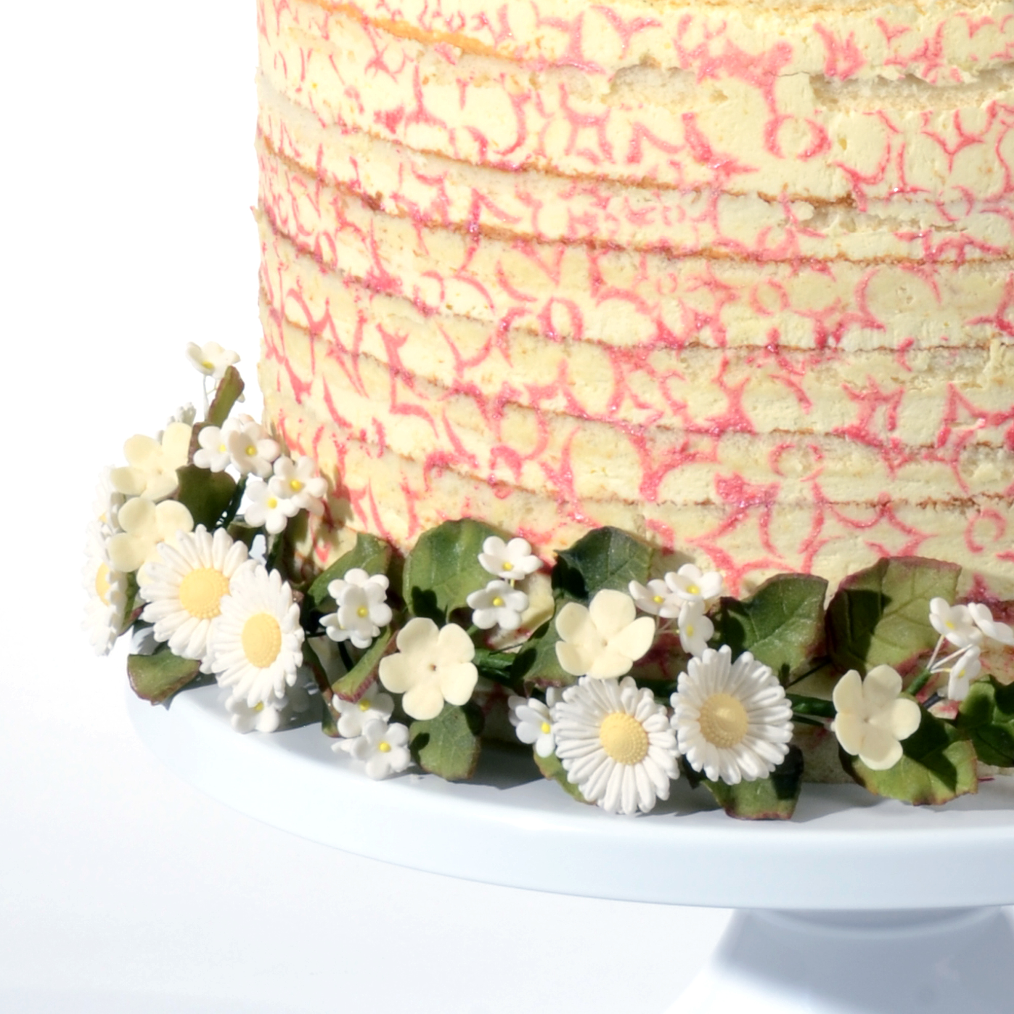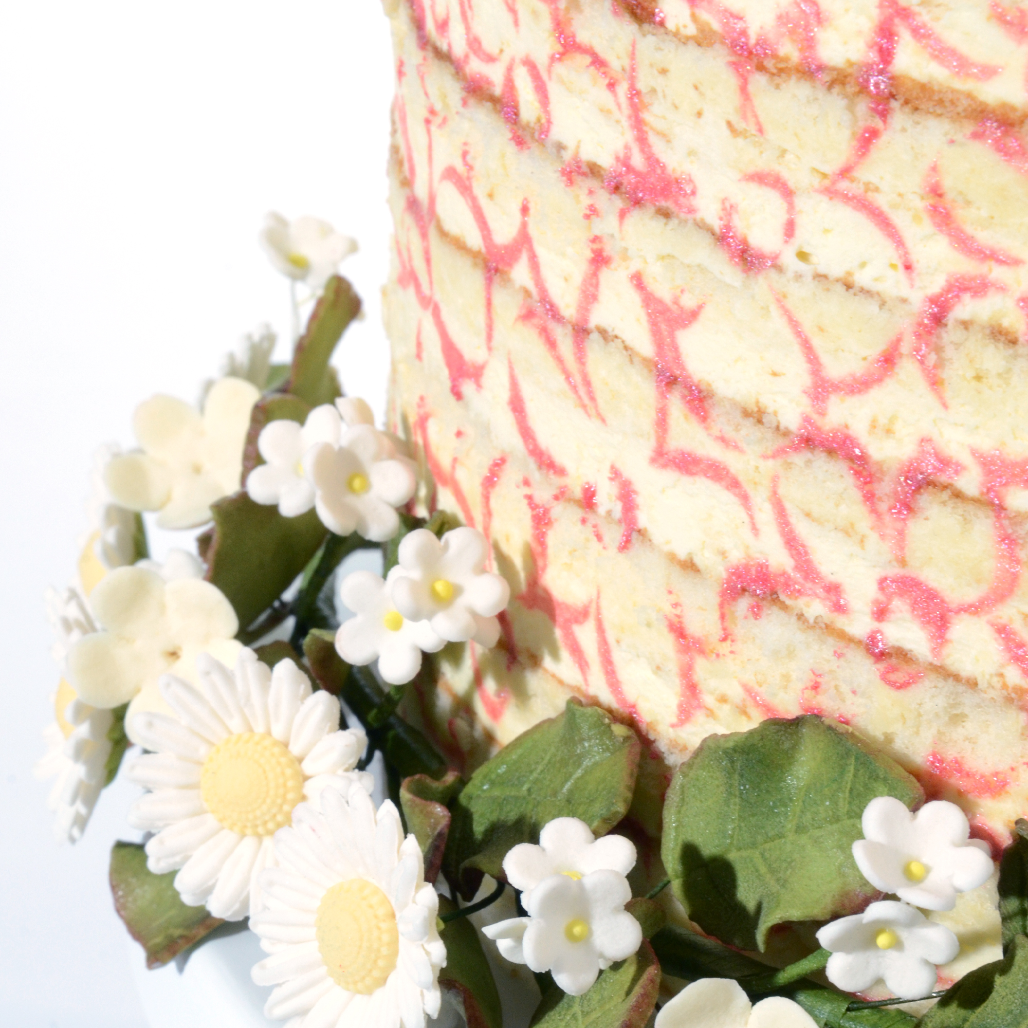 Für die einzelnen Etagen dieser 3-stöckigen Torte wurde abwechselnd Bisquit und Buttercreme in die zum Tortenständer passenden Ringe eingesetzt. Das ergibt eine "Festliche Torte" im "Naked Cake" Stil.Mit zwei verschiedenen Textil Schablonen und himbeer metallic gefärbtem Kaltgel zeigen wir hier, dass auch auf der Oberfläche einer "Naked Cake" der filigran feine Dekor dieser Schablonen sehr gut aussehen kann. Das lustige Brautpaar "BETTY" und Tragant Bouquets mit Margeriten und Gänseblümchen passen optimal zum Stil dieser Torte.