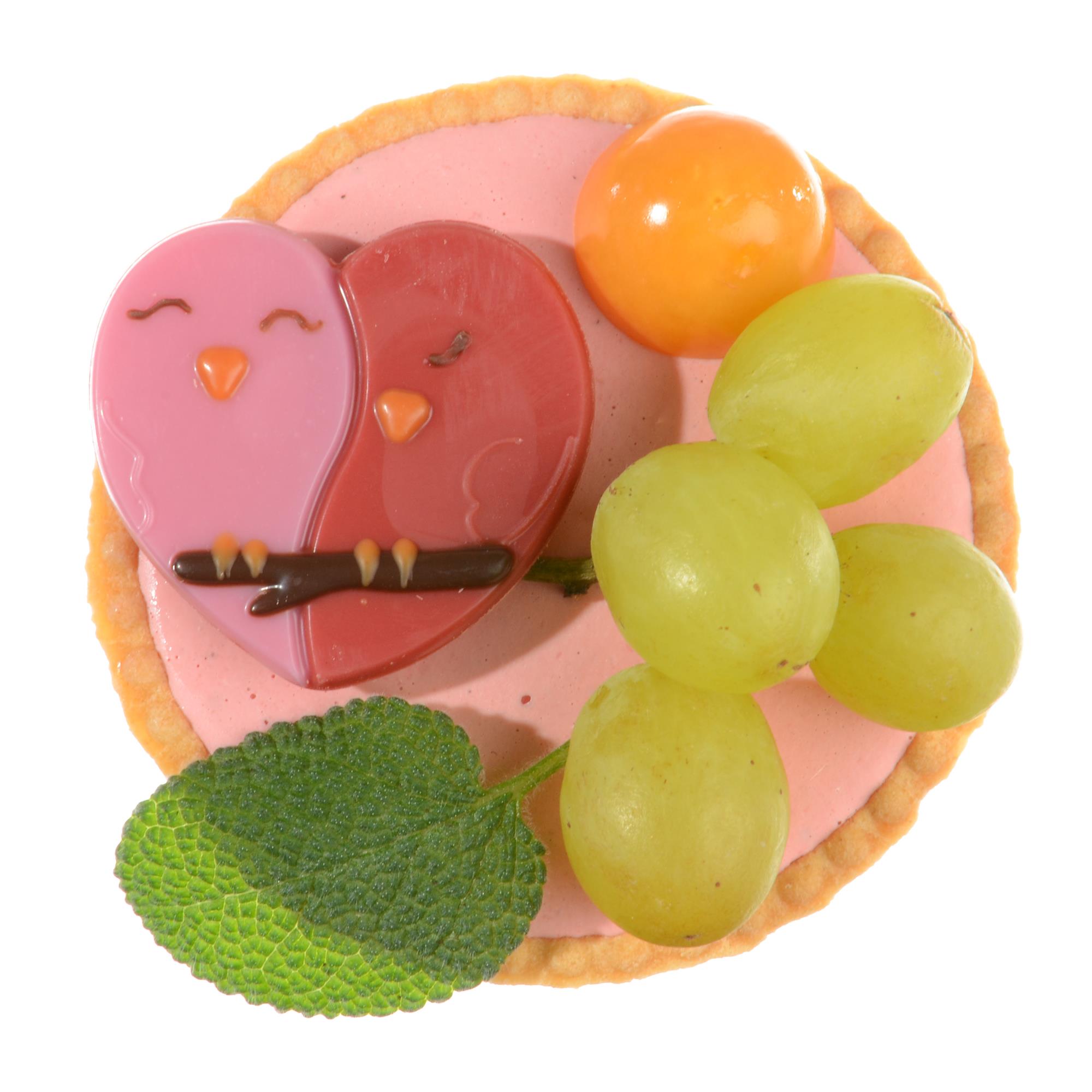 Diese Herz Aufleger sind aus gefärbter weißer Schokolade hergestellt. Das Motiv der beiden aneinander geschmiegten Vögel mit plastisch hervorgehobenen Teilen ist ganz besonders ansprechend. Für Ihre Torten, Törtchen, Tartlets, Cupcakes und Desserts für liebevolle Anlässe sind diese Vogel Herzen einfach ideal. Verpackt sind die Aufleger bruchsicher zu 90 Stück in einer Spezialschachtel.Feuchtigkeitsfest